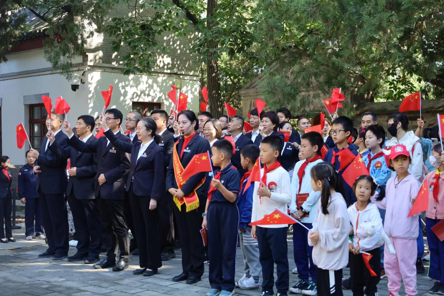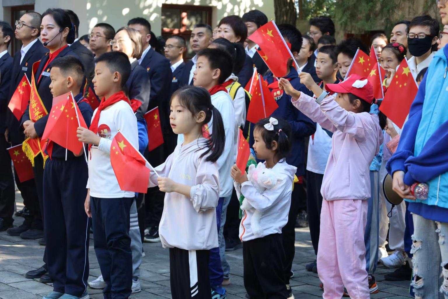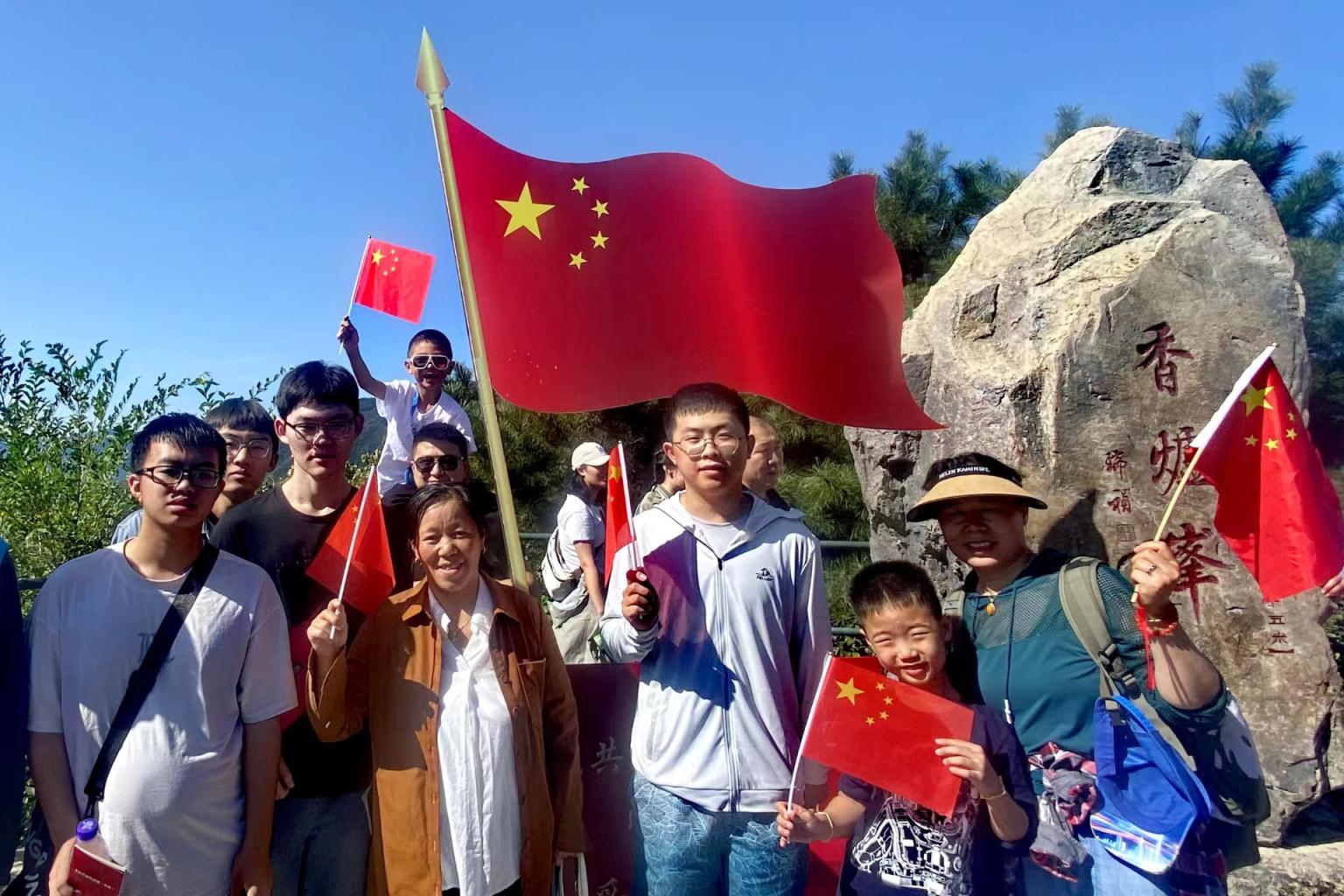 国庆节一早,参加“我眼中的红色香山”深度游的市民游客跟随着党的二十大代表贾莉,重走“进京赶考”路。在全国爱国主义教育示范基地双清别墅内,大家共同参加升国旗仪式,合诵红色诗歌、高唱《歌唱祖国》,把祝福送给祖国母亲。