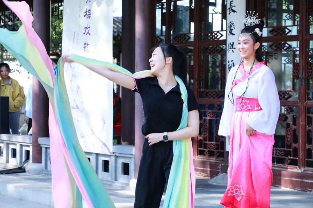 在园博园的各个舞台上,戏曲艺术的群众力量正悄然迸发着蓬勃生机。北京邮电大学在读研究生韩婷初中的时候就喜欢唱黄梅戏,但一直没有跟专业老师进行系统学习过,当看到本届戏曲文化周将举行丰富多彩演出的消息后,就兴冲冲来到忆江南园,穿上戏服登台跟老师体验一下《女驸马》选段。“很开心在园博园的舞台得到了跟专业老师学习的机会,这也算是圆了我的一个梦想。虽然我不是专业的戏曲演员,但始终怀着一颗热爱的心。”韩婷说,“戏曲艺术需要我们年轻人发扬。以后,我希望好好学唱腔、声调,练好基本功,能够顺畅的把身段做好,唱腔唱好。”