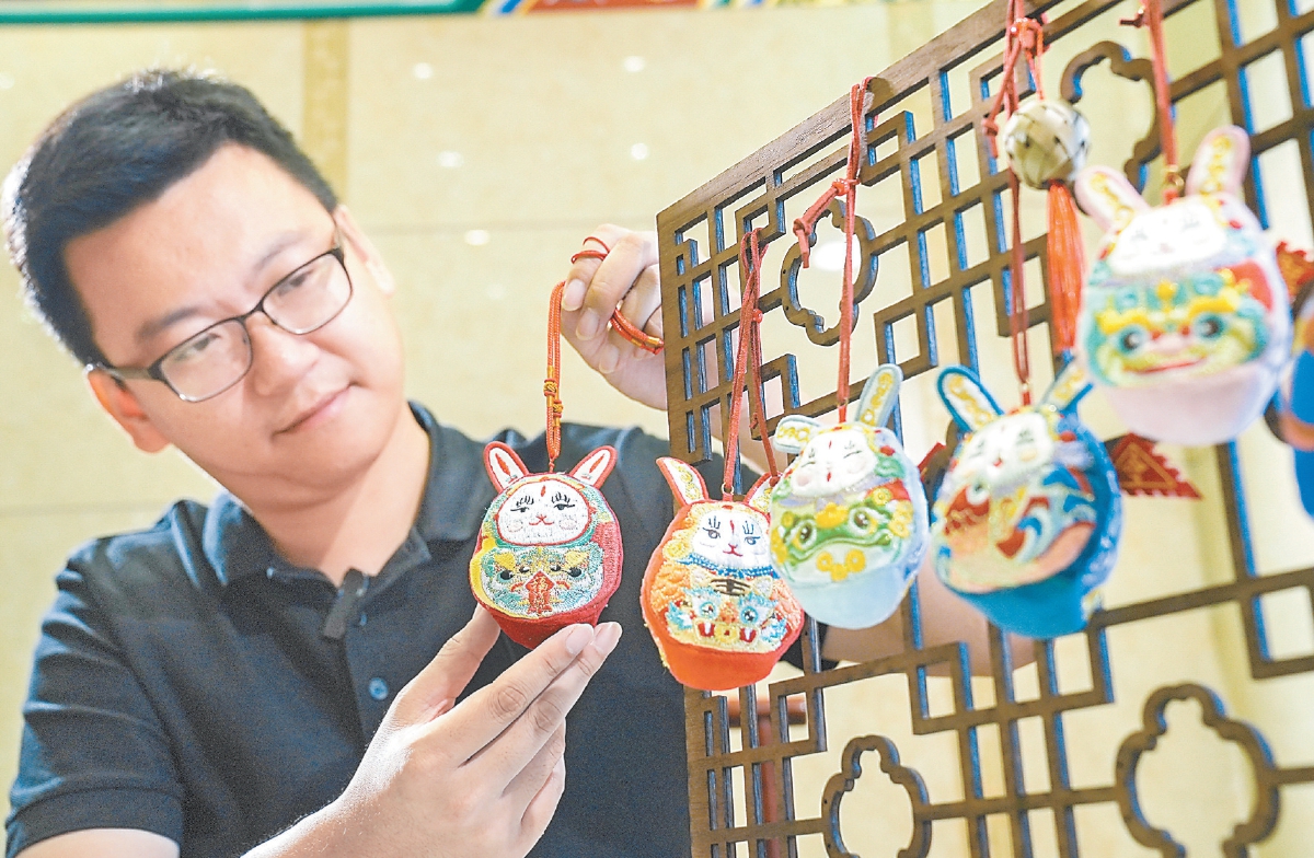 胡游在展示兔儿爷香囊,外表借鉴了北京非遗技艺,内里填入了提神、安神等配方的中草药。 本报记者 武亦彬摄