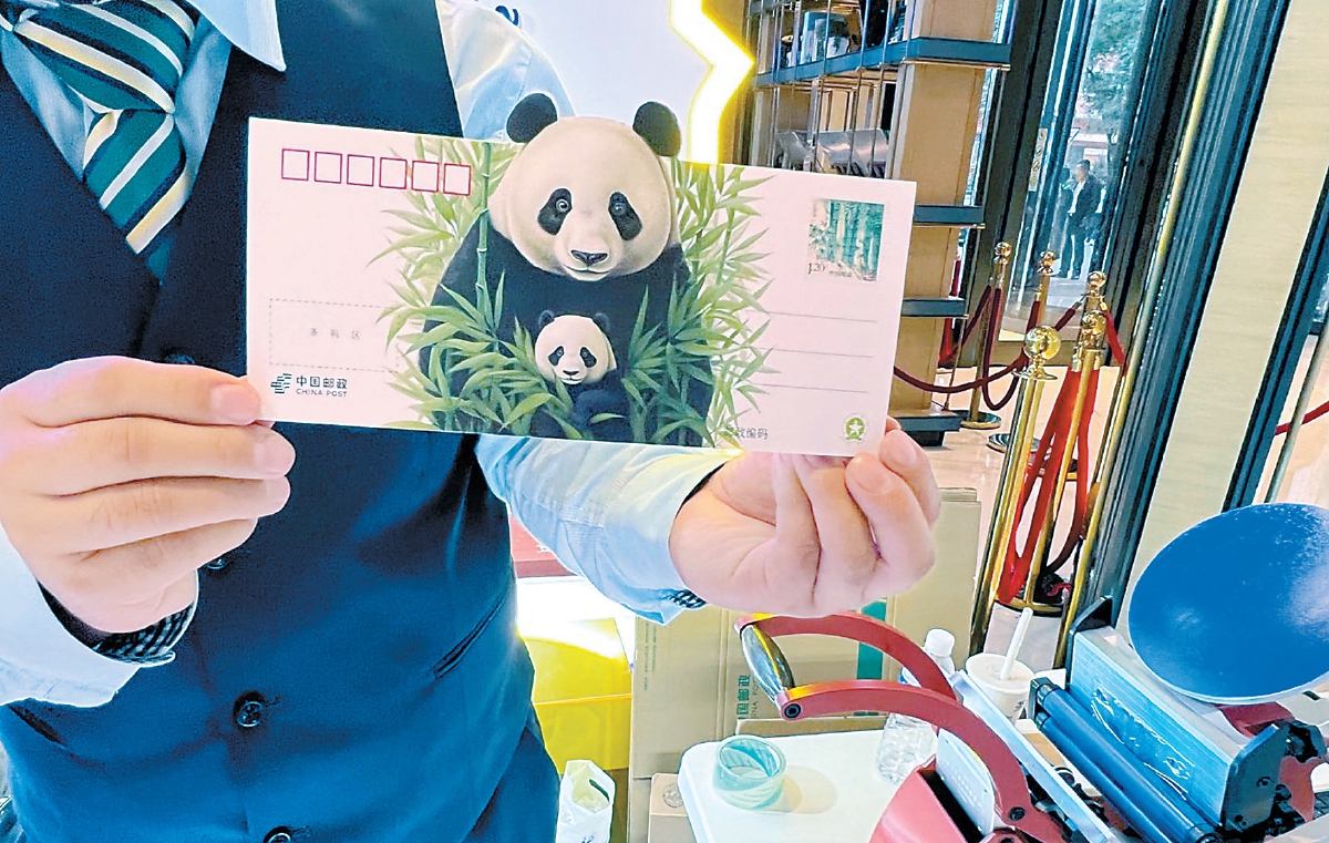 在三里屯通盈中心洲际酒店一层,“北京礼物”和“一带一路”文创产品展售专区吸引不少外宾驻足。图为工作人员展示非常抢手的熊猫主题明信片。 本报记者 马婧摄