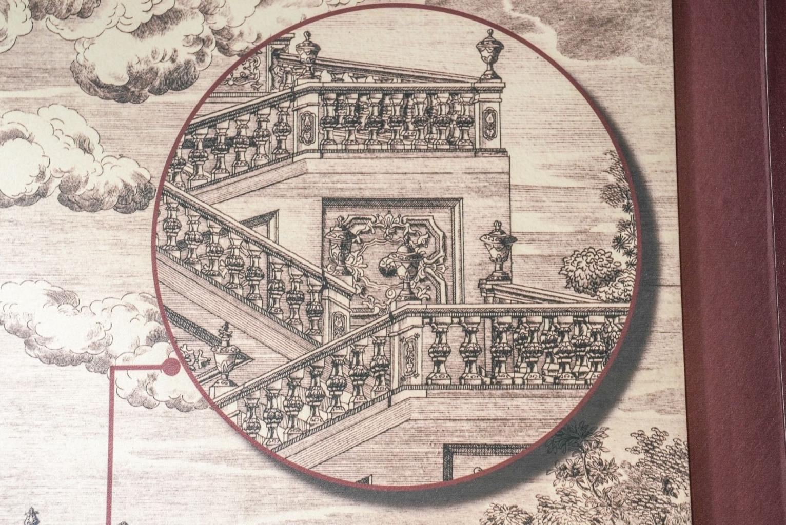 “这7根石柱的雕花是西式花瓶,但是花瓶里面是我们中国象征富贵的传统花卉牡丹花,这体现了中西合璧的文化内涵。”圆明园管理处主任邱文忠介绍,“石柱后面的背景采用西洋楼的铜版画,在当年没有照相的时候,铜版画可以真实地反映当时建筑的实际场景。”在现存乾隆五十一年(1786)西洋楼铜版图中,可见海晏堂、谐奇趣、方外观、养雀笼、远瀛观等均使用了较多的石柱,这些石柱分布于庭院、喷泉池边、楼梯、楼层平台等处,有着实用及审美的价值。
