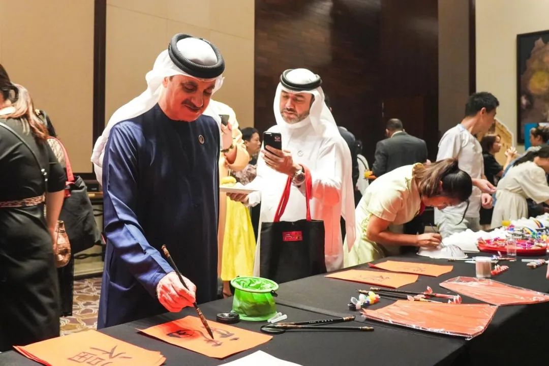 活动现场设置了中国文化体验区和北京美食品鉴区,嘉宾纷纷体验北京非遗兔爷拓印、中轴线标志建筑拼插、中国书法、扇面、京剧绘制、抖空竹等项目,品尝美味的中国美食,对中国文化和中华美食产生浓厚兴趣。阿联酋著名沙画艺术家在现场制作了兔爷、沙燕、北京CBD等沙画作品,表达了阿联酋人民对北京的美好向往。