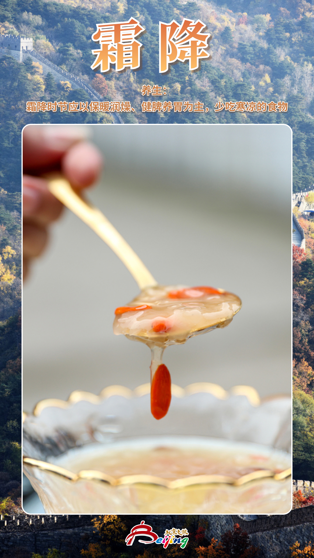 霜降时节,秋燥渐重,此时易出现咽干、鼻干、皮肤干等秋燥症状,可多食些润燥养肺的食物,例如时令水果梨和苹果,味道清甜,可生津润肺;蔬菜可多食胡萝卜、冬瓜、莲藕等,其它如蜂蜜、银耳、百合等也是不错的选择。
