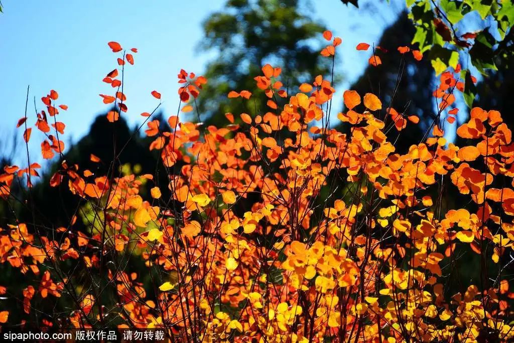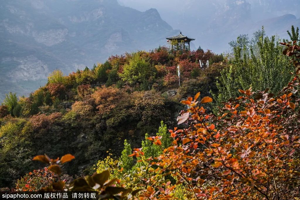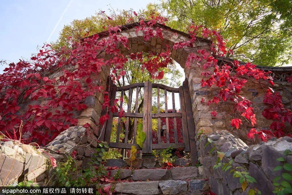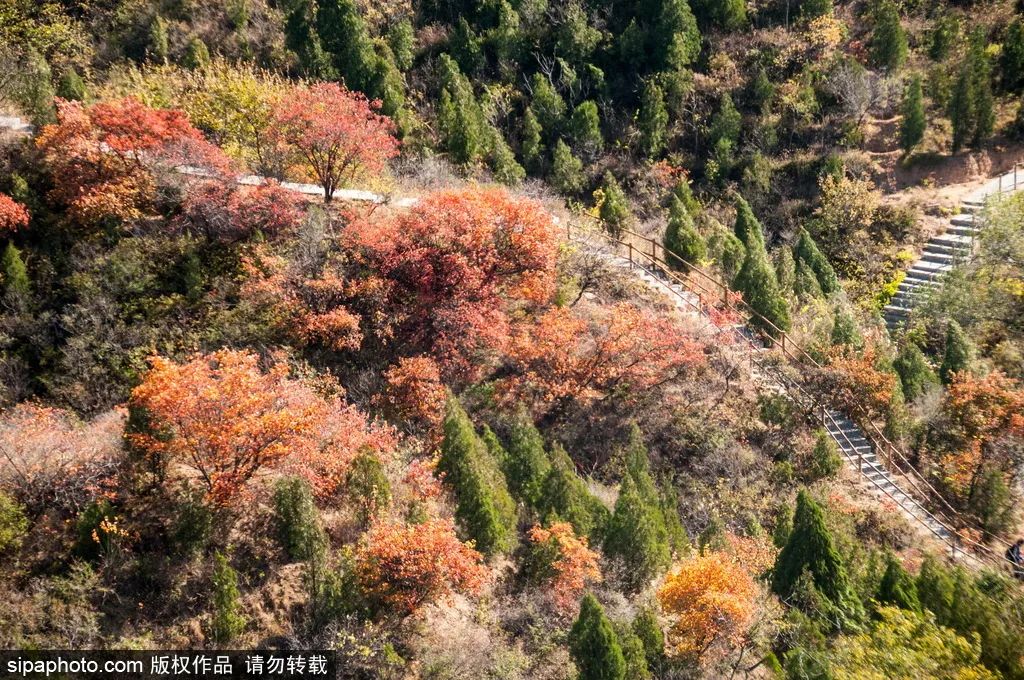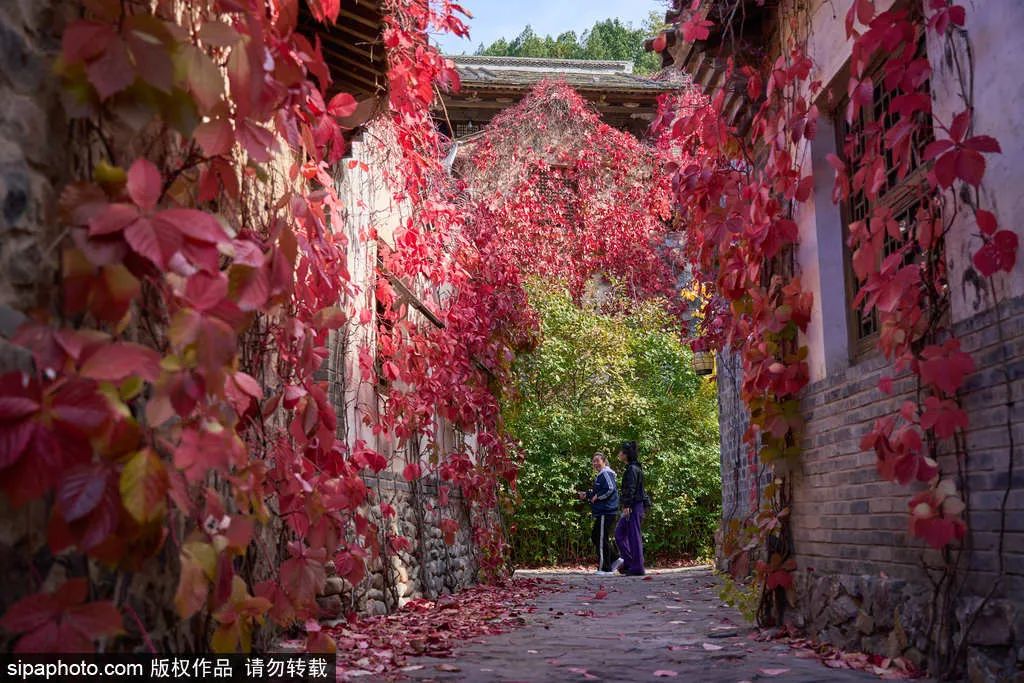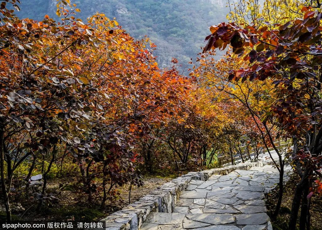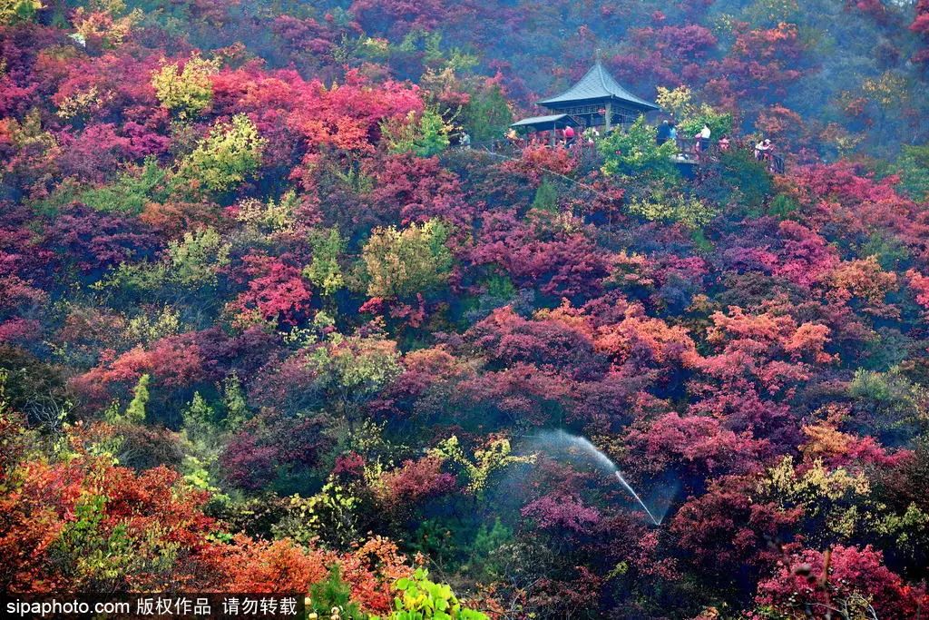 目前,这里的红叶开始已经大面积变红。到11月上旬,落英缤纷、依依飘零,景区内最后一抹红标志着秋去冬来。