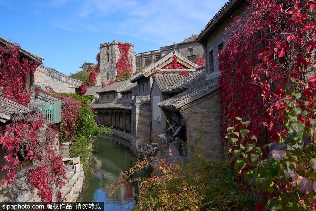 眼下,古北水镇满眼秋色,漫步景区,看红叶漫过屋脊;乘摇橹船泛舟汤河,赏两岸宜人秋景;依水而建的房屋倒映水中,与碧水、红叶相映成趣。