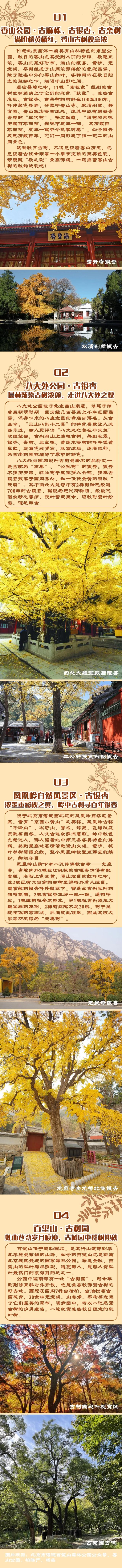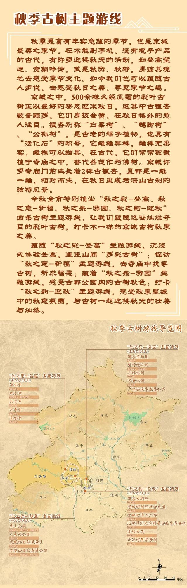 时光匆匆,走过古树繁花的春日和绿荫如盖的盛夏,转眼又到了京城最美的秋天,而遍布全市的古树,也会在这个时节换上了绚烂的“秋装”。作为“多彩京秋”系列活动之一,首都绿化委员会办公室发布了以“秋之彩-登高”“秋之意-祈福”“秋之乐—游园”和“秋之韵—迎秋”为主题的4条秋季古树主题游线,让市民在北京最美丽的季节中,感受壮美古树带来的文化魅力。