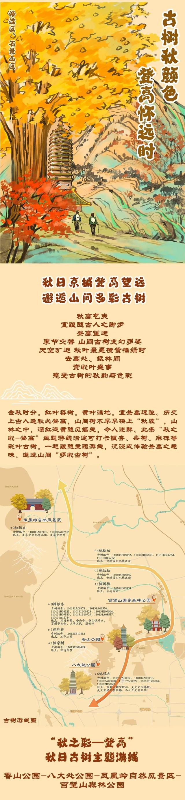 为了让首都市民更加了解古树,感受古树文化魅力,首都绿化委员会办公室深入挖掘古树历史文化内涵,结合古树观赏特性,以文化为线索,依托线上线下多种形式,于今年春季正式启动发布古树主题游线。截至目前已推出了春、夏、秋共计12条不同主题的古树游线。今秋的4条游线分别以“秋之彩-登高”“秋之意-祈福”“秋之乐—游园”和“秋之韵—迎秋”为主题,分布于首都功能核心区、海淀区、石景山区、门头沟区等地,让市民从中寻找银杏、栾树、元宝枫、麻栎等古树在秋季绚丽多彩的颜色。