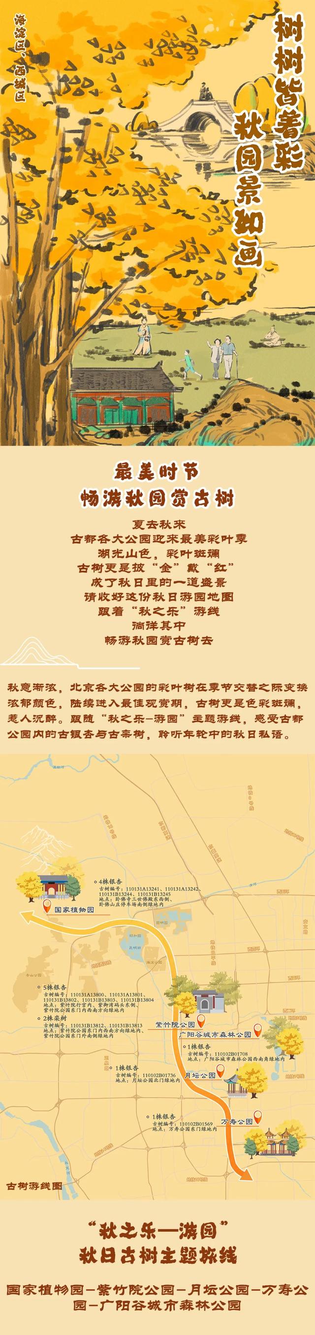 为方便市民了解各条游线的特色亮点,首都绿化委员会办公室制作了游线海报,市民游客可关注首都园林绿化官方微博、微信,或登录北京市园林绿化局官方网站了解具体信息。在此,首都绿化委员会办公室也诚邀并欢迎广大市民朋友跟着游线地图,打卡秋日里如调色板般的古树,近距离感受古树的缤纷色彩与壮美传奇,倾听古树年轮里的故事。据悉,未来全市还将推出冬季古树赏游路线,市民朋友们可通过这些主题游线,和季节相约,来一场与众不同的citywalk,近距离欣赏京城古树四季分明的美好景致。