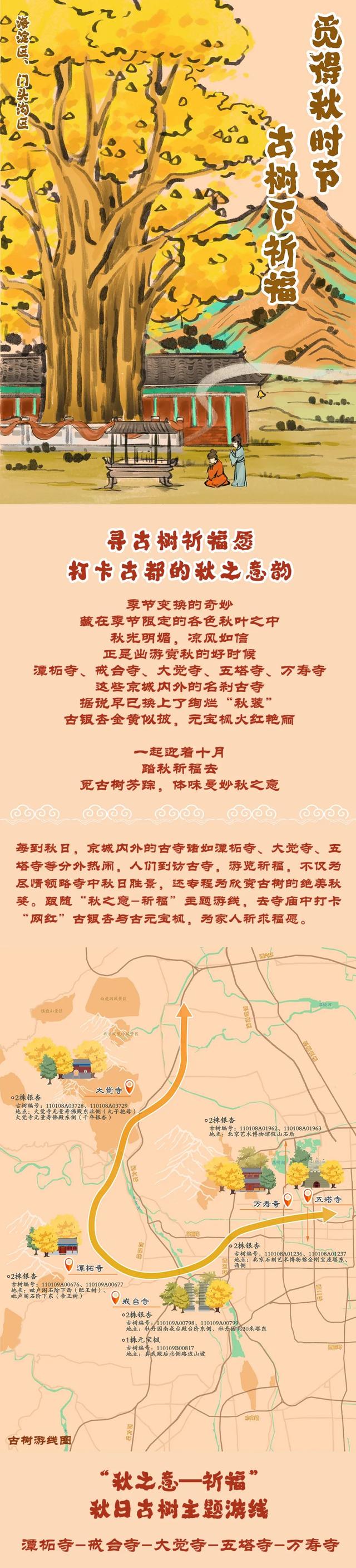 来一场秋日祈福之旅,感受京城潭柘寺、戒台寺、大觉寺、五塔寺、万寿寺的古朴与禅意,于古寺古树下祈求福愿。