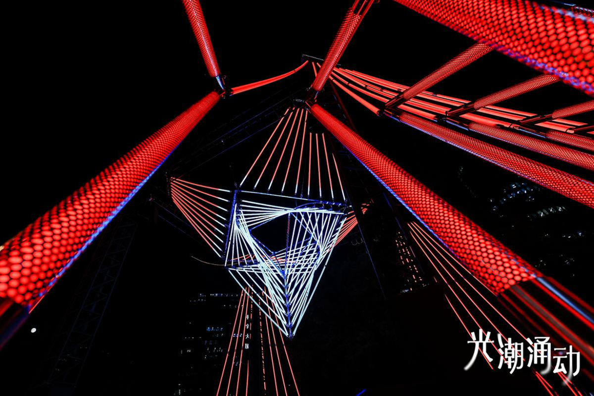 《电光竖琴ChronoHarp》在太古里南区展出,作品设计理念来自传统西洋乐器竖琴,具有较高的演奏门槛。这套光电作品利用灯光感应技术,打造出一台所有观众都可以“演奏”的“竖琴”。亮灯仪式上,围在装置四周的观众轻轻拨动安装在地台上的感应弦,就能合奏出一首独一无二的乐曲。