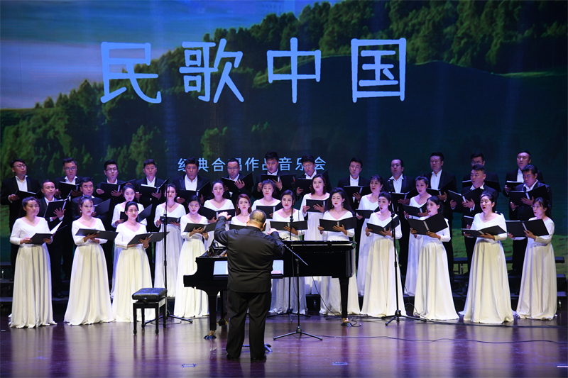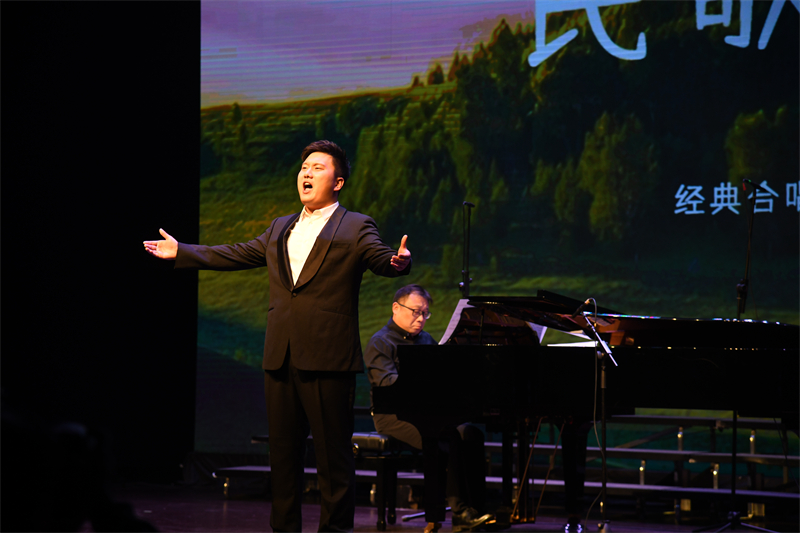 歌如天籁,琴声悠扬笛声脆。音乐会在醉人的和声中拉开帷幕。《天边》《草原夜色美》《八骏赞》《在银色月光下》《赶牲灵》《大青藏》一曲曲经典民歌徐徐铺陈开来,“远方有一座高山,那是你博大的胸襟”“草原夜色美,唯举金杯人已醉”“在那金色沙滩上,洒着银白的月光”……一幅幅美丽画卷,跃然眼前,一个个律动的音符,悦耳醉心。