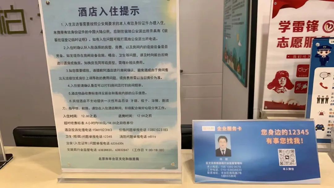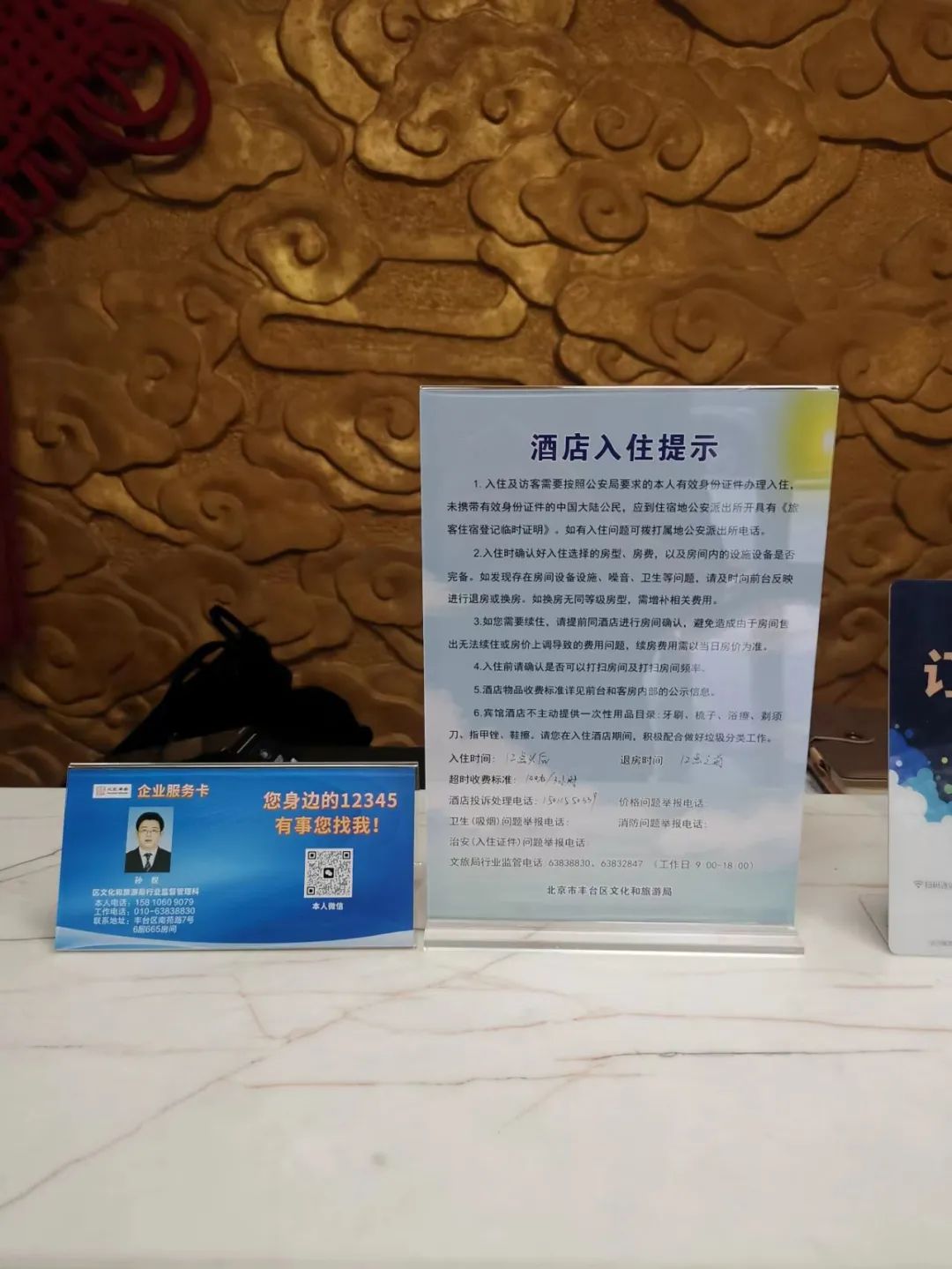 为提升住宿业经营服务水平,营造人性化、暖心贴心的住宿氛围,近日,丰台区文化和旅游局向全区600余家宾馆酒店投放1200份企业服务卡和酒店住宿温馨提示牌,放置酒店前台明显处进行公示。