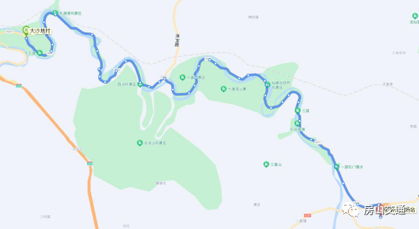 沿途设站:张坊公交场站、张坊镇政府、下寺路口、片上村、一渡南、一渡、二渡、三渡桥南、三渡、三渡西、四渡东、四渡、五渡桥、五渡村、五渡、六渡东、六渡、七渡、七渡村、七渡西、八渡北、八渡、十渡卫生院、九渡、十渡、十渡镇西庄、十渡镇西庄村西、西河村、前头港村、十二渡、房山瓦窑、西石门村、北石门村、片南、平峪村、东湖港、天花板村、下留财村、上留财村、大沙地村。
