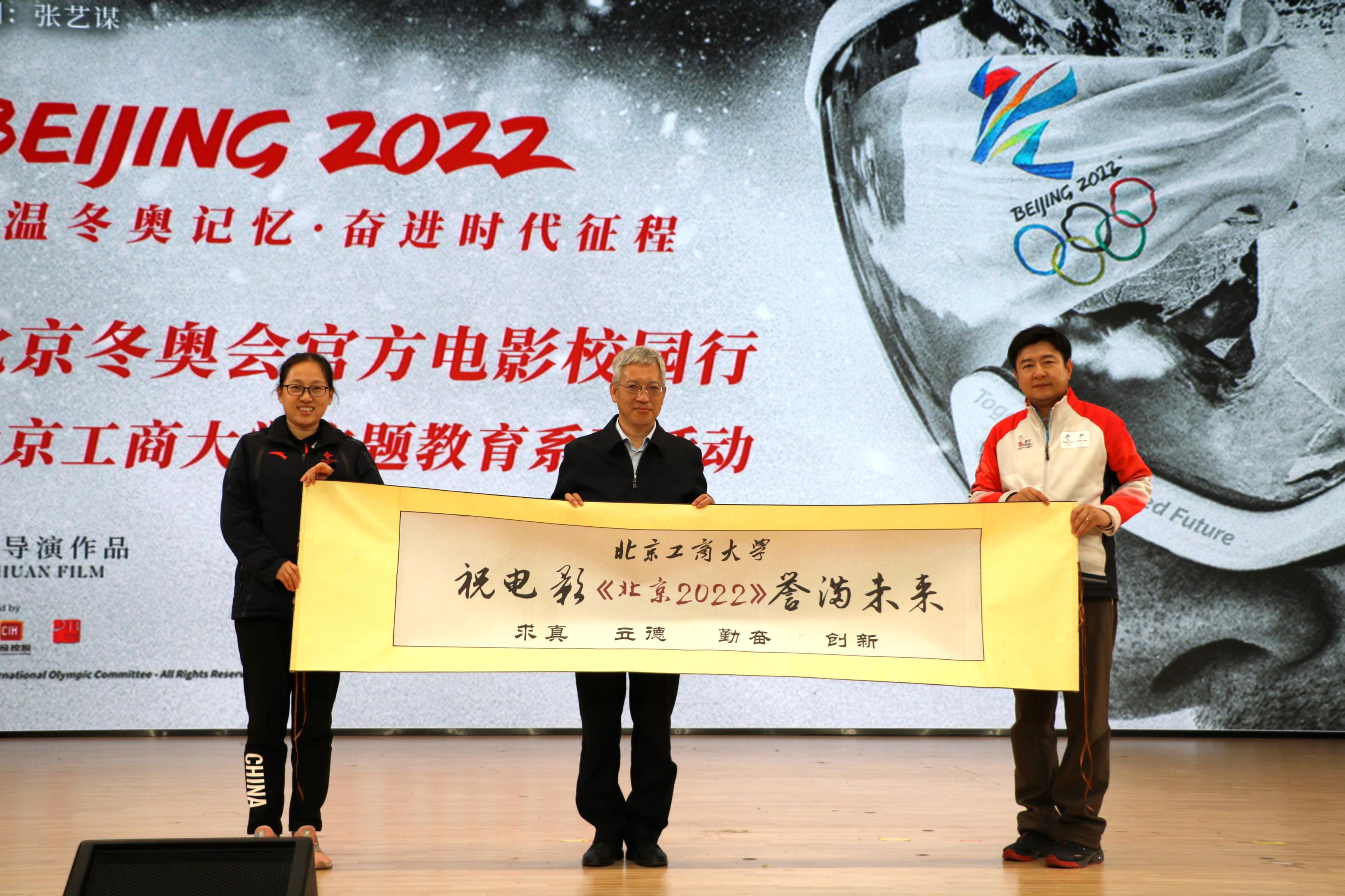 北京工商大学党委副书记李中奇代表学校向出席活动的《北京2022》主创团队赠送祝福画轴。他希望,全校师生要继续弘扬北京冬奥精神,继承好、运用好冬奥文化遗产,坚定听党话、永远跟党走,让冬奥“大思政课”更立体、更生动。同时,全校师生要深入思考、有效转化,不断探索“冬奥+”“冰雪+”新发展模式,将北京冬奥精神转为学校育人的强大动力内核,努力写好后冬奥时代北工商的“答卷”。此外,要推进冬奥遗产可持续性利用,让冰雪运动在北工商“燃”起来,让体育成为我们的共同语言,持续推动冰雪运动高质量发展。