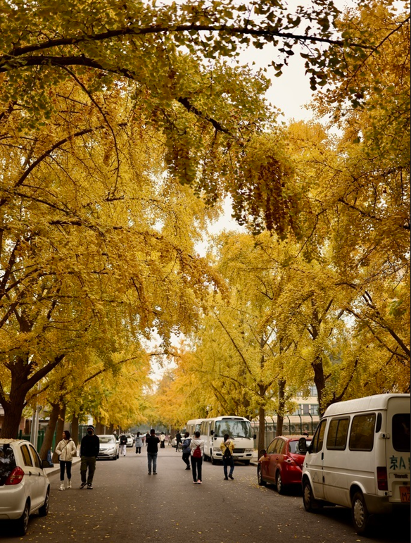 十一月初,北京三里屯东五街的银杏已黄了近一半,进度条正在拉满中,天气渐凉叶子也会变得越来越黄。在最佳观赏季,东五街两三百米的银杏大道漫天金黄,放眼望去好似金黄色的“瀑布”。