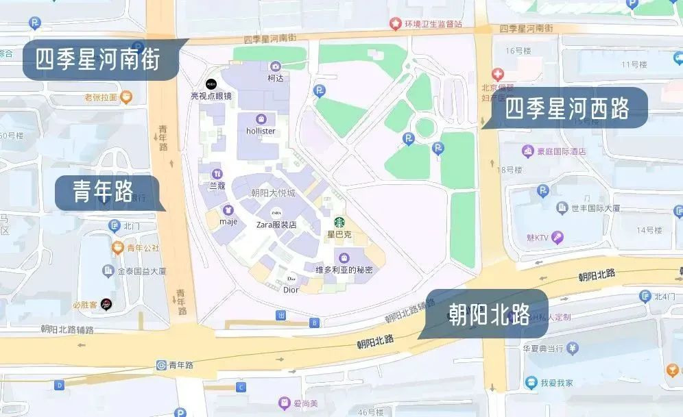 大悦城西侧,通过在青年路与四季星河南街交叉口处增设二次过街安全岛,完善非机动车引导标志标线等,对道路全线进行慢行友好改造,并在朝阳北路辅路设置2处限时上落客区及相关引导标志,规范网约车、出租车停车秩序。