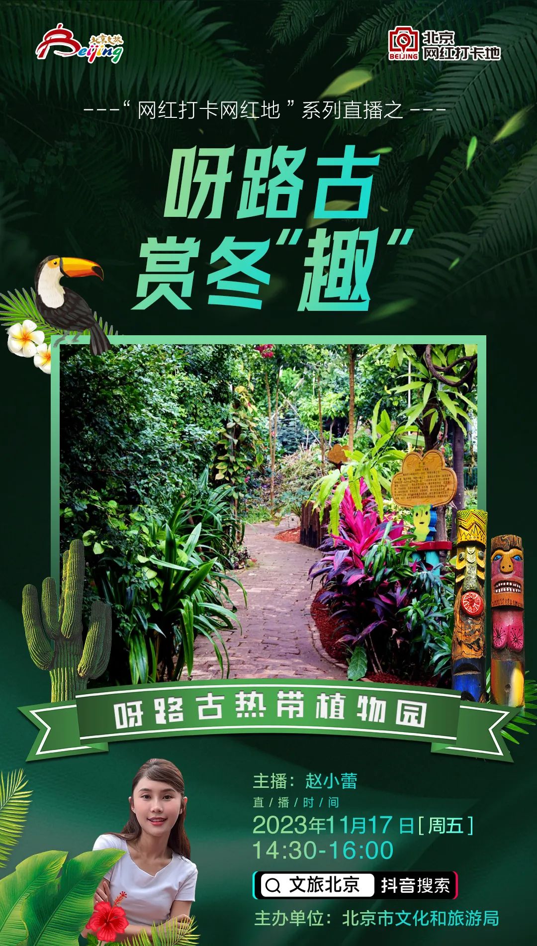 “网红打卡网红地”系列直播之“呀路古赏冬‘趣’”篇,特别邀请到了抖音探店达人@赵小蕾带您走进大兴区呀路古热带植物园,走进北京的“西双版纳”。