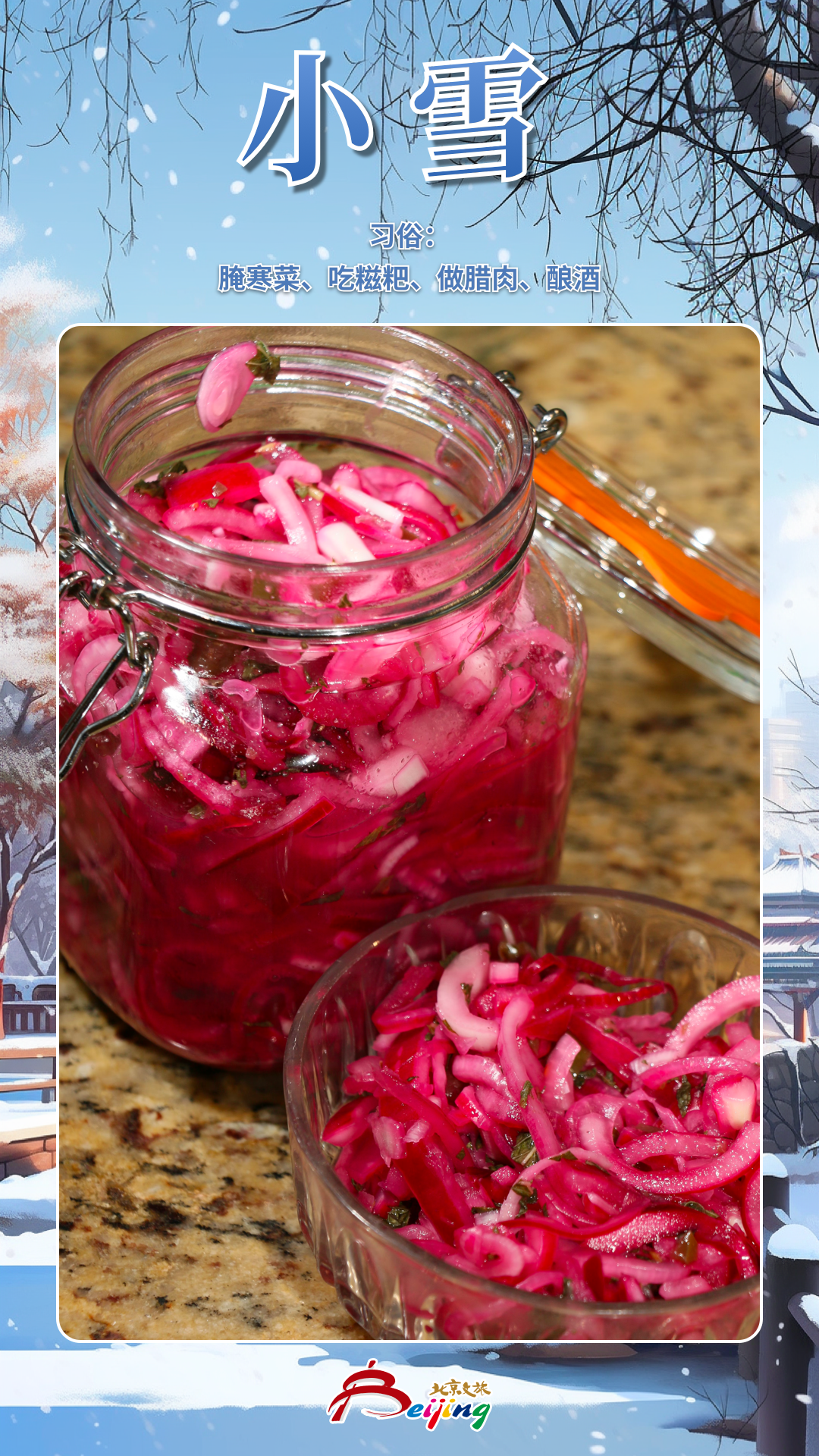 北方有句俗语:“小雪收葱,不收就空。萝卜白菜,收藏窖中。”北方的人们会在千里冰封之前,收获并储藏好过冬的蔬菜,腌制蔬菜就是最常见的一种储存方式,既保存了蔬菜又增加了爽口的味道。