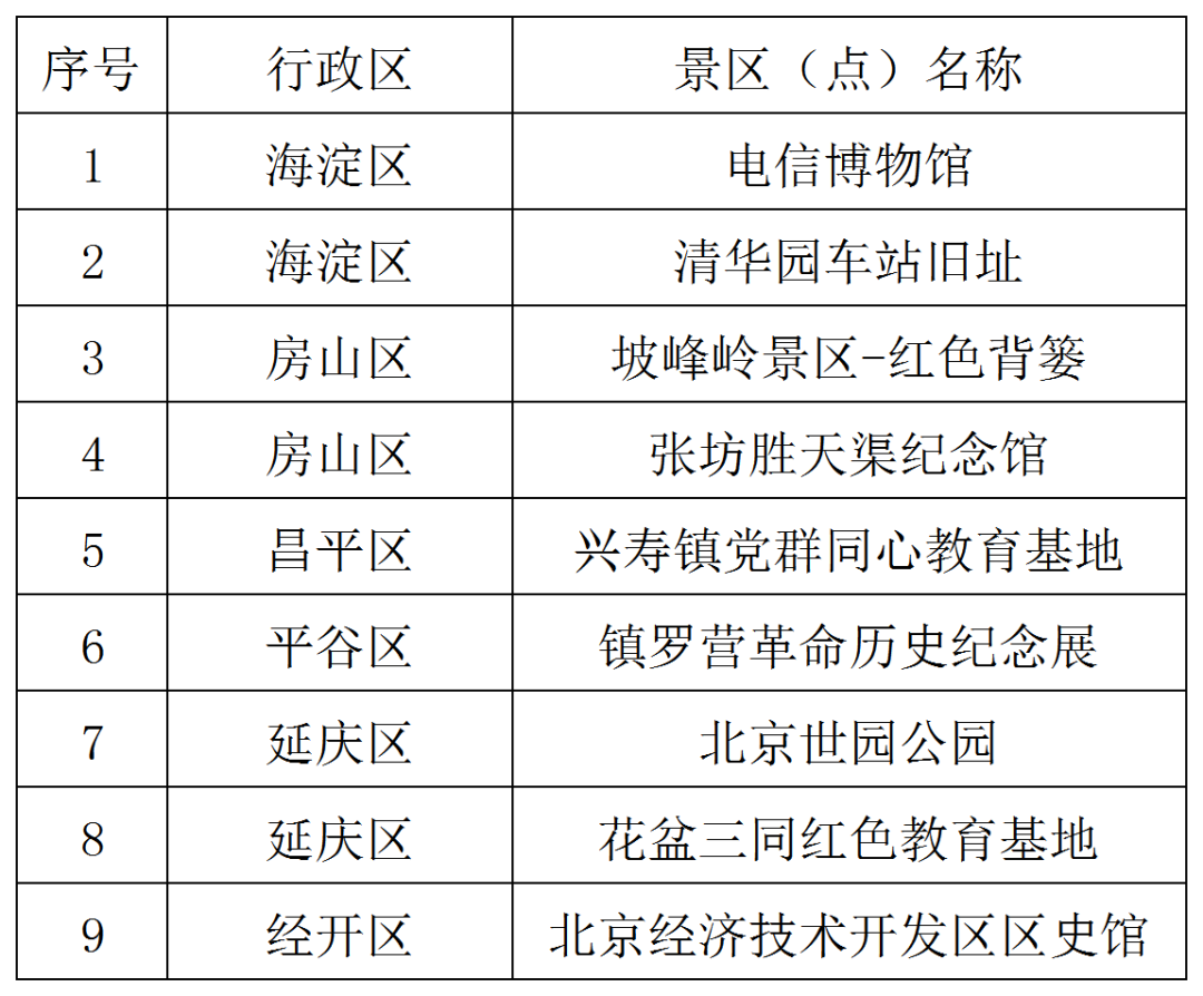 根据《北京市红色旅游景区(点)评定管理办法》(京文旅发〔2022〕43号),经初审、现场访查、评审会评议等评定程序,2023年通过评定的北京市红色旅游景区(点)共9家。名单公告如下:
