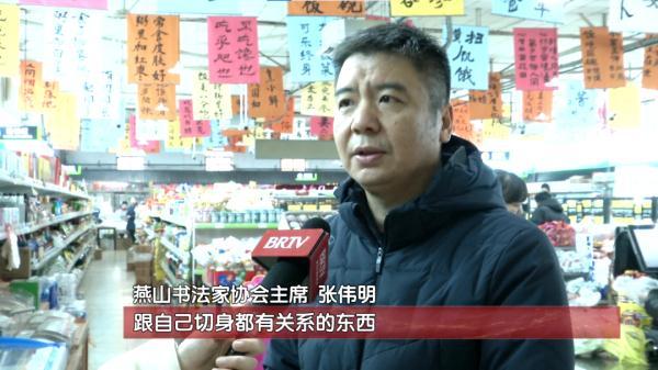 燕山书法家协会主席张伟明说:“一开始是选的内容是长幅的《将进酒》,但是我们觉得这个词和我们柴米油盐、市井的文化、市井的东西可能有点格格不入,后来经过我们多方的讨论之后,就确定成今天这种形式了,书写一些谚语,一些老百姓都能熟识的句子,跟自己切身都有关系的东西。”