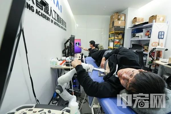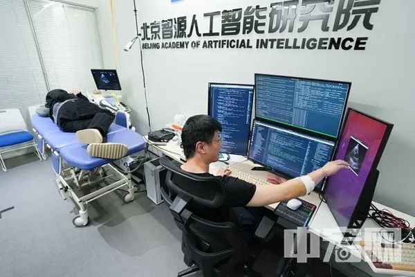 走进大楼4楼办公区的一间小型会议室,让记者顿时产生穿越之感,仿佛来到了医院的诊断室。只见一名工作人员侧卧在一张医疗床上,旁边一台机器触手正在这名工作人员的心脏部位的胸部表面来回移动。在床尾的电脑显示屏上,动态显示机器触手捕获到被测目标的心脏跳动画面,画面类似于超声波检测图像。这是智源院科研人员通过大模型开展的一个医疗检测科研应用项目。