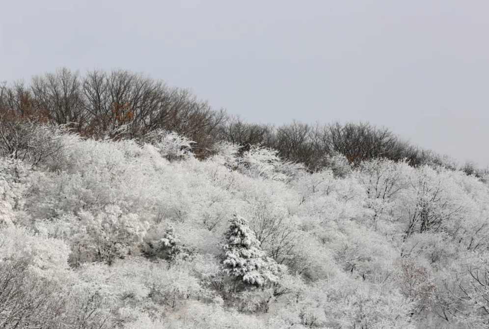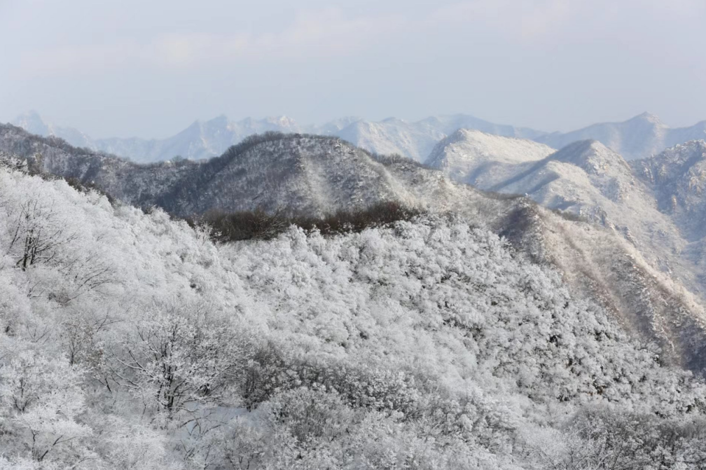 随着气温骤降,罕见的雾凇美景光临山区,漫山遍野的植被披上银装,晶莹剔透、宛若仙境。