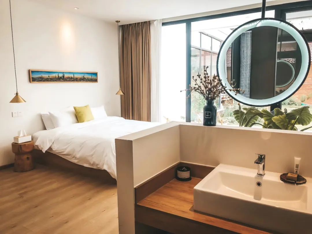 民宿步行三分钟便可到达金海湖边。这里有连绵起伏的山峦、波光粼粼的湛蓝湖水以及秋天漫山遍野的红叶,春天在院里种下蔬果花植;夏天去湖边垂钓欣赏落日;秋天漫步山林赏漫山红叶;冬日围坐火炉听雪涮火锅......是一处难得能够远离城市喧嚣,安享世外桃源般宁静惬意的私享之境。