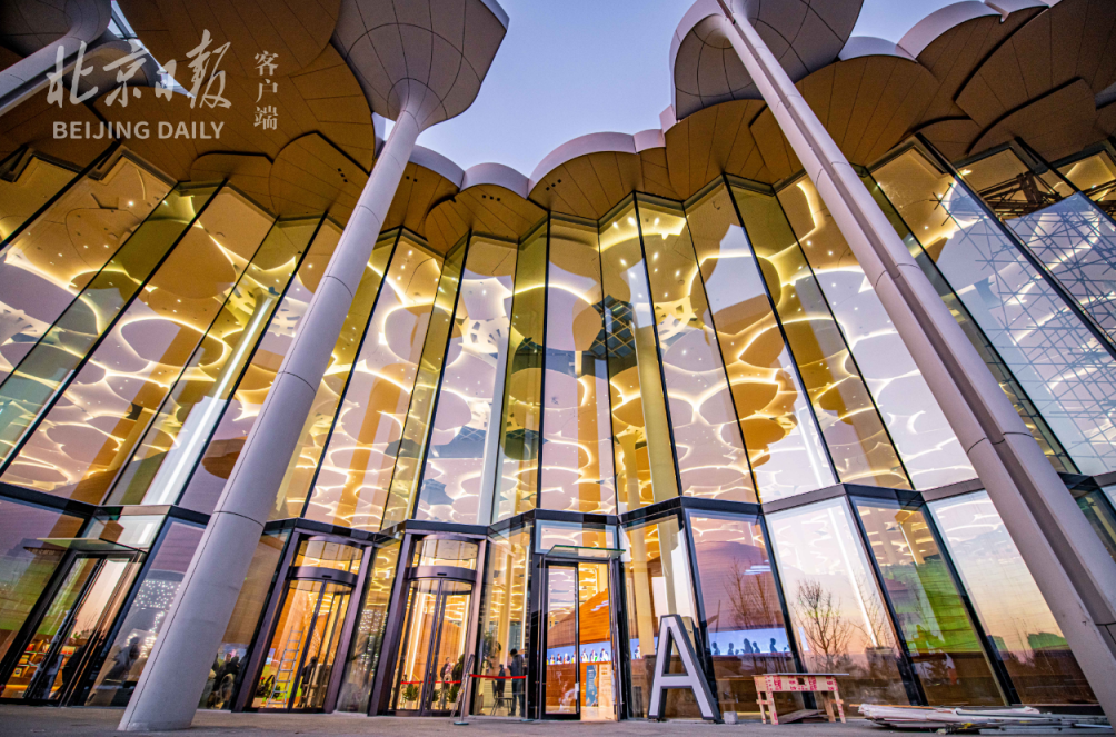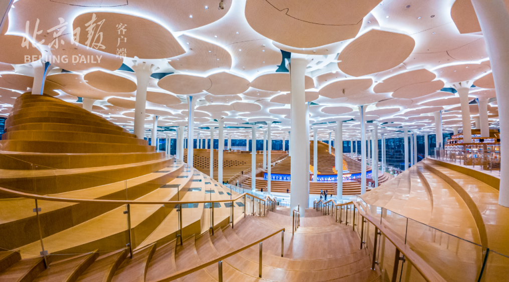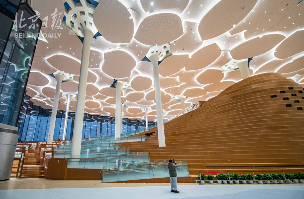 城市副中心三大建筑之一北京城市图书馆,12月27日即将对外开放。记者今晚来到大运河畔,以银杏叶为灵感的图书馆屋顶,在夜幕之下,灯光璀璨。