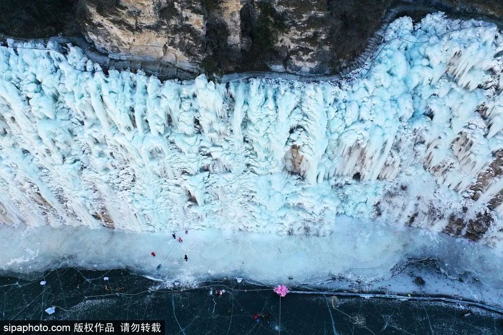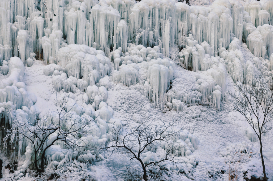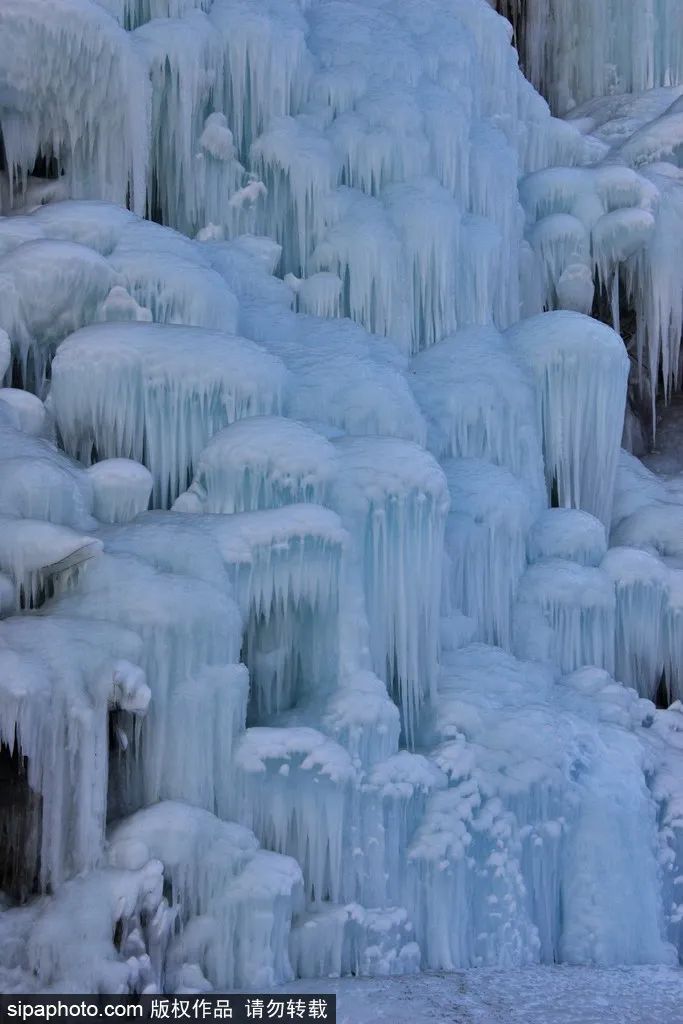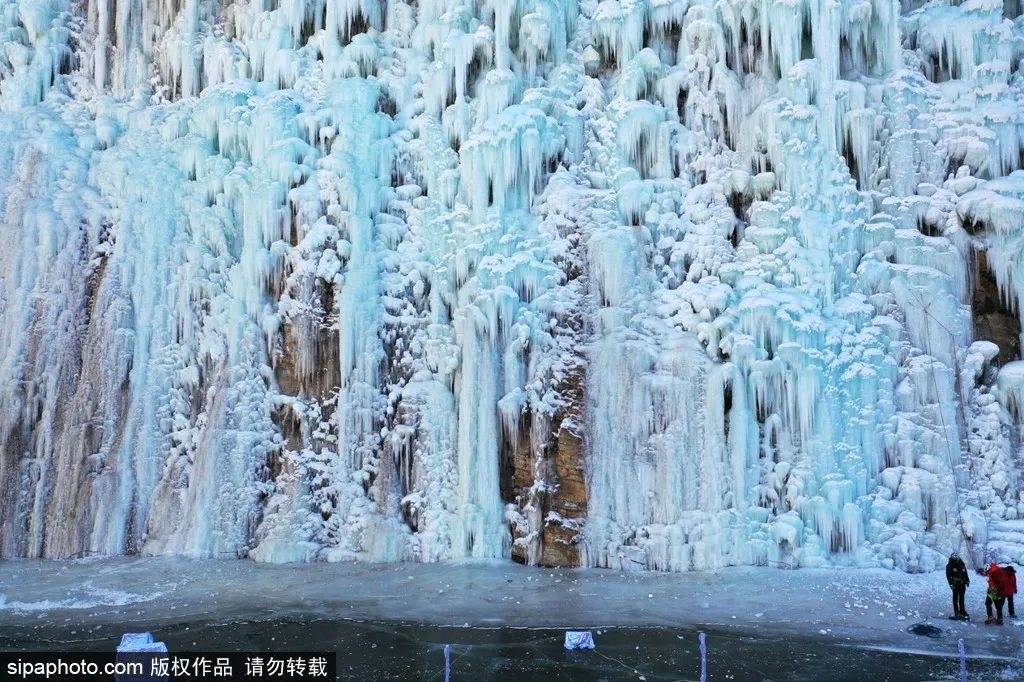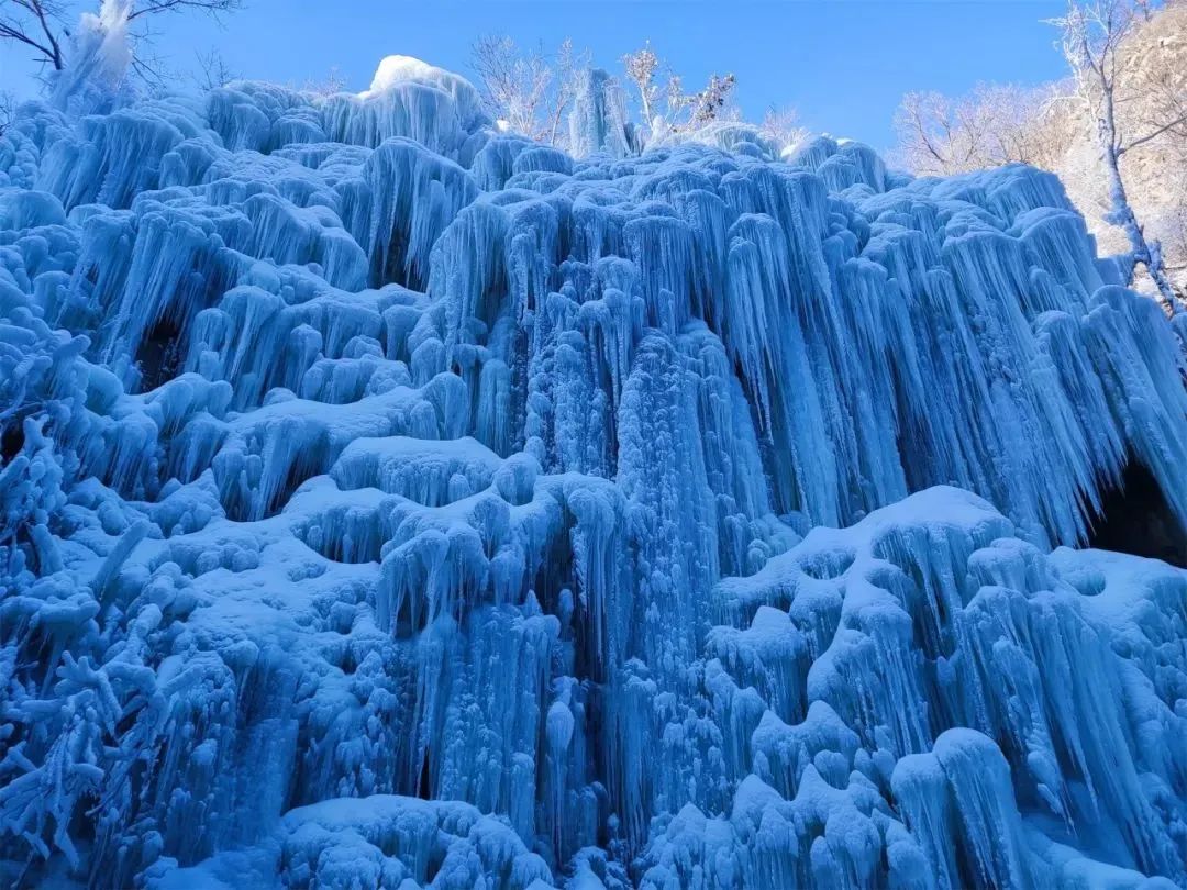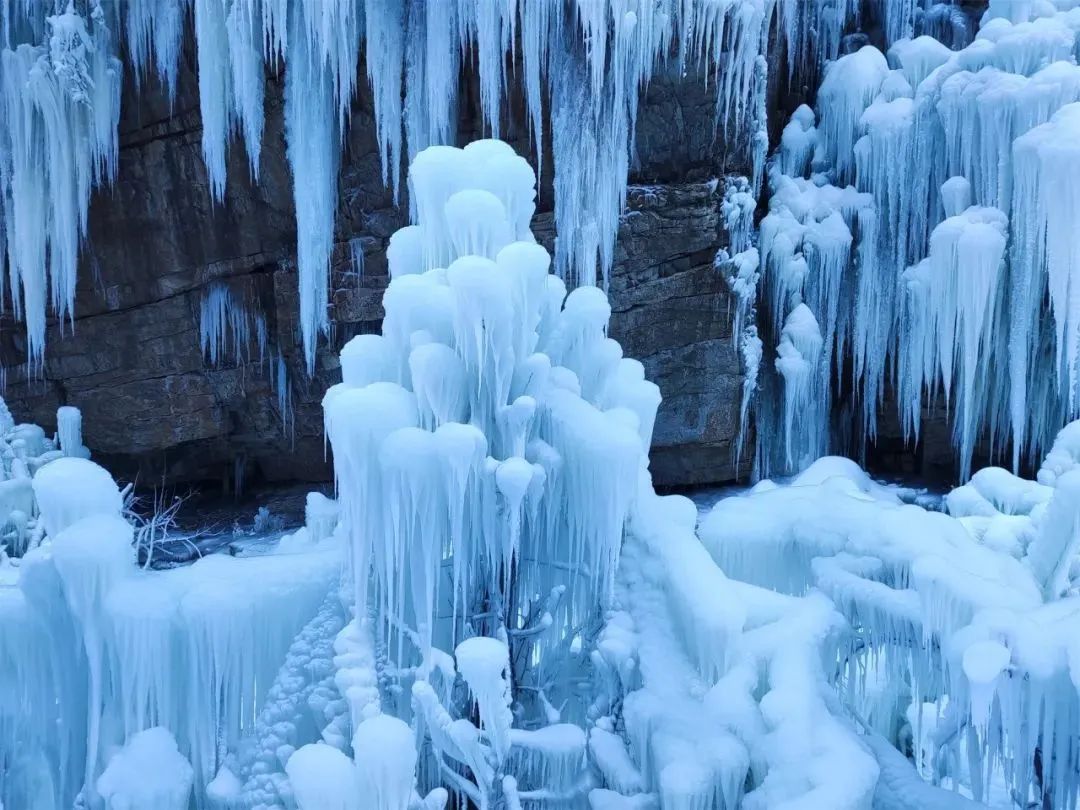 此时,夏日里泉水叮咚的山谷缀满了一条条银装素裹的冰柱,壮观的巨型冰瀑,高悬在山涧崖壁之上,沿路前行300余米的人工冰壁、冰挂,呈现出蘑菇状、莲花状、水滴状等各色形态,在这里打卡拍照绝对出片。