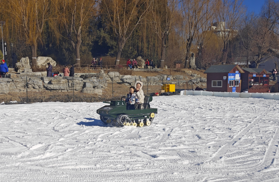 不仅是柳荫公园,北京欢乐谷首届奇幻冰雪节也为游客带来了新年新体验。圣托里尼风情冰雪小镇的布景让市民在家门口就能体验异域风情的“雪乡”。占地近千平方米的户外冰场晶莹剔透,面积上万平方米的湖心雪场上,雪地转转、雪橇、超大雪山坡道香蕉船等花样戏雪游乐设施为游客提供了多元的冰雪体验选择。