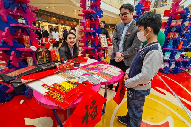 据其介绍,写福字用的是前不久刚上市的“龙墨”。从鼠年开始,老字号每年都制作限定生肖墨汁,在黑墨基础上加入一定比例的金墨,写出福字看上去金光点点,既有福气又有贵气。给学生体验拓印技艺的拓印套装也十分受欢迎,朱墨、宣纸、拓板都齐全,把古老技艺带到学生身边。