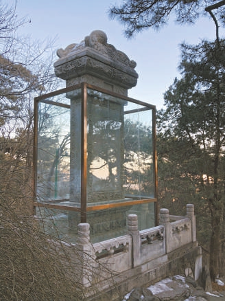 下至谷底,爬两段陡峭的石径,转过弯,途经一片松林。在半山腰忽而迎来了“柳暗花明”。路牌上赫然写着:“西山晴雪”。抬眼望去,真的是玻璃四围起来的“西山晴雪”碑,乾隆皇帝270多年前所立。风雨已将石碑与石栏杆吹打圆润,但“西山晴雪”四字依旧清晰,碑身后侧的御制诗也依旧明了: