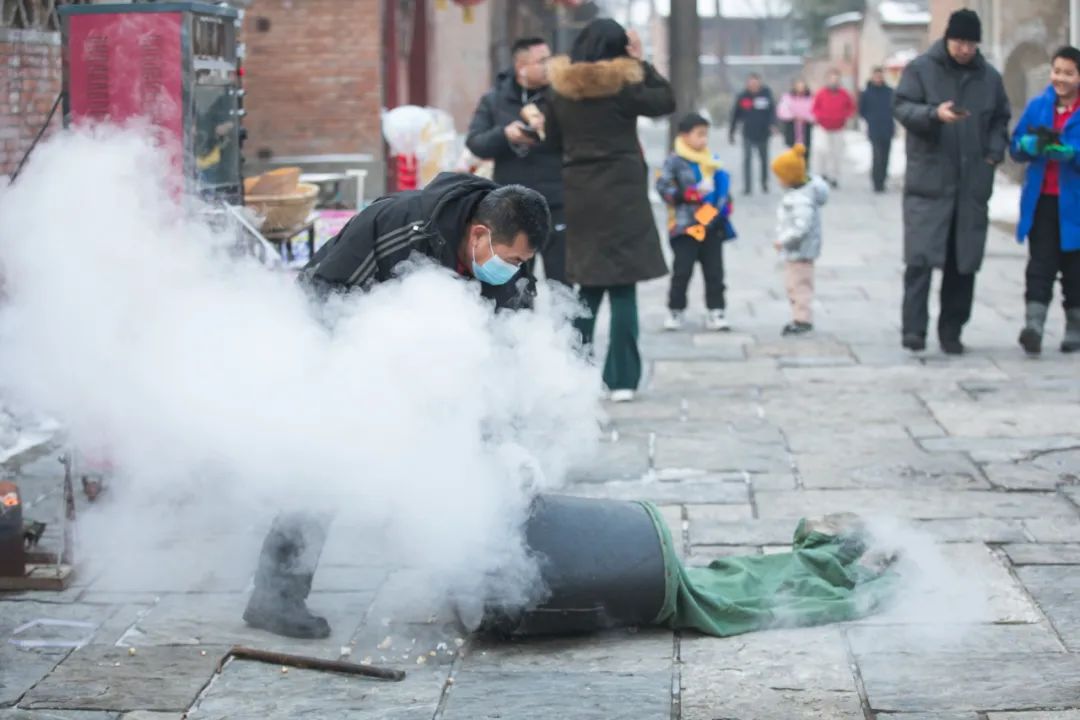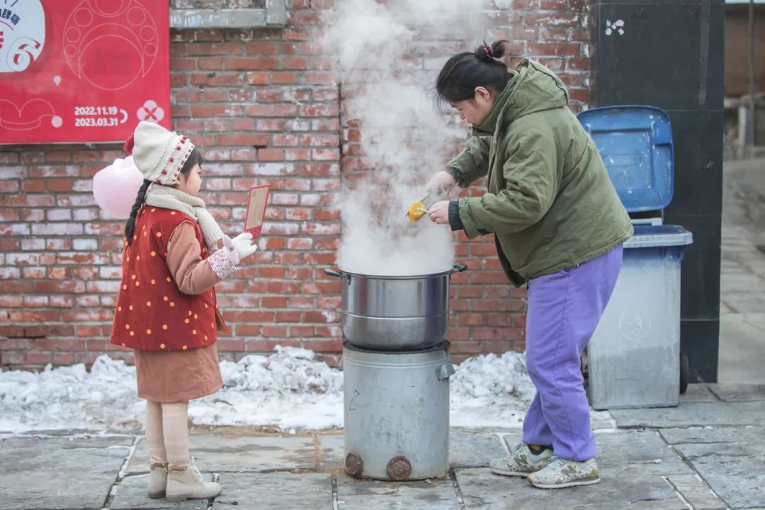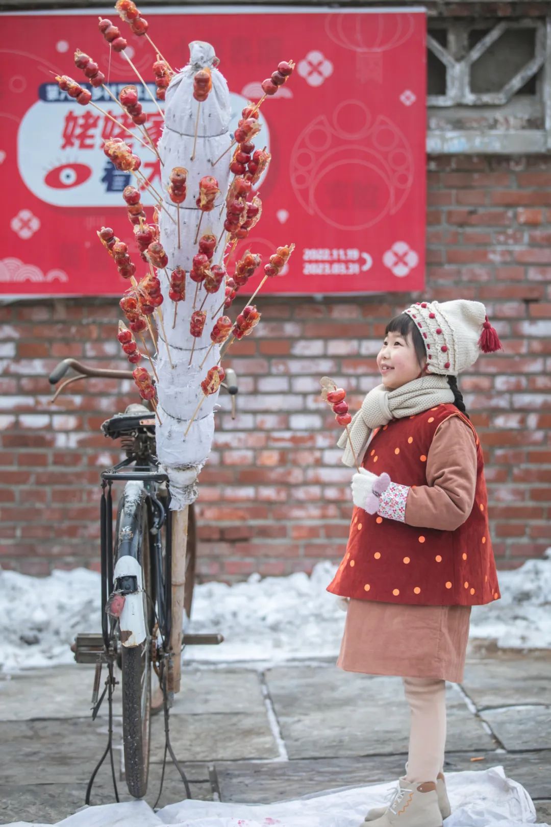 一进村口,路两旁就是热腾腾的摊位:煮得熟烂的甜玉米、留着蜜汁的烤红薯、现做现吃的糖葫芦,一切都在告诉我们,原来回到小时候一切幸福都变得十分简单。一切都是年味儿不可或缺的因素。