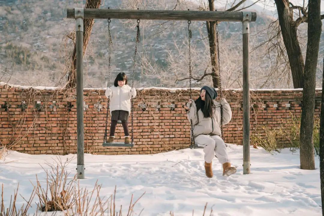 山林旁,森林木屋、旋转滑梯,冰雪卡丁车,只有孩子的撒欢声才能打破这一丝宁静。一连串的笑声响彻山谷,惊飞了一群留守的冬鸟,消失在山林的深处。