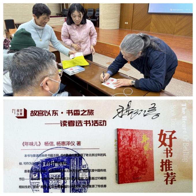 在分享过程中,杨信还提到了一些作画中的趣事。他回忆起当年创作《年味儿》一书时,由于时间紧迫,画作上出现了瑕疵。为了弥补缺陷,他采用了以在腊八粥那幅画上添加小孩儿的办法来转移观众的注意力,使得瑕疵不那么明显。杨信的坦诚让现场读者更加亲近这位京味民俗画家,纷纷要求在活动后合影留念。