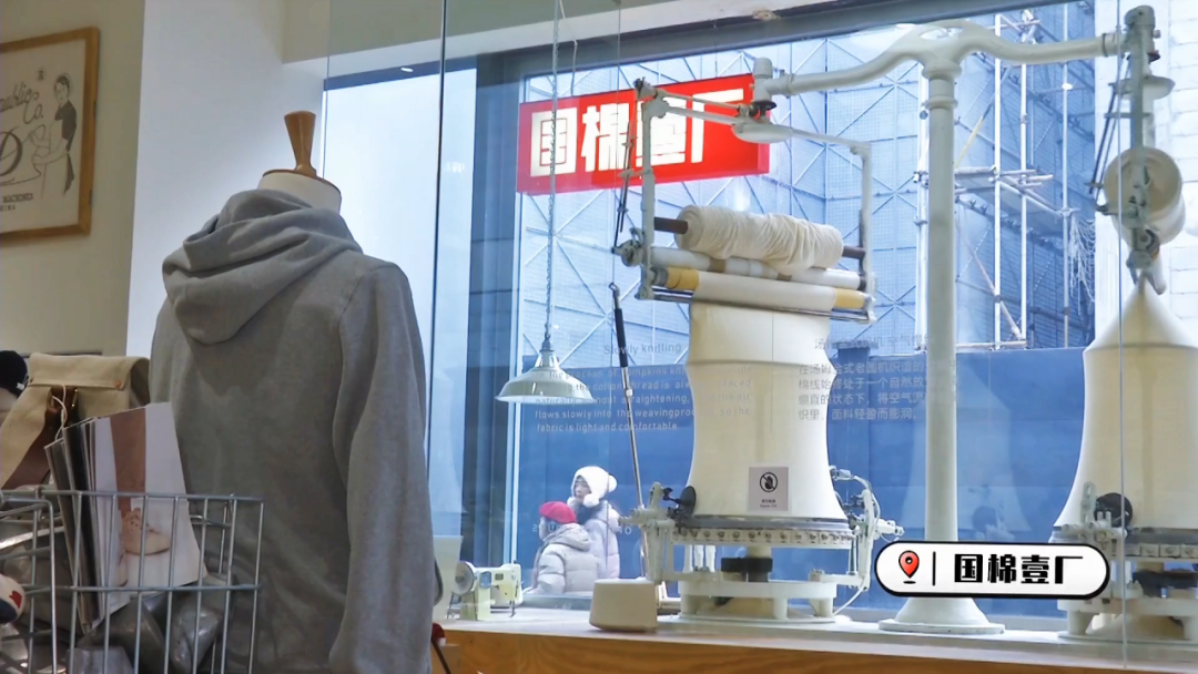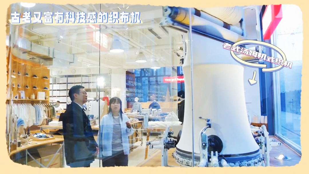 接着,我们来到了刘区长推荐的“国棉壹厂”,一起体验我们的国潮品牌。“我看这两台织布机很有年头,但也特别有科技感,它的工作原理是什么样的?”刘区长好奇地问道。工作人员介绍:“这两台是老式的汤姆金式织机,机器在织造的过程中,棉线始终处于一个自然放置、无紧绷的状态下,也是我们品牌慢生活的理念。”