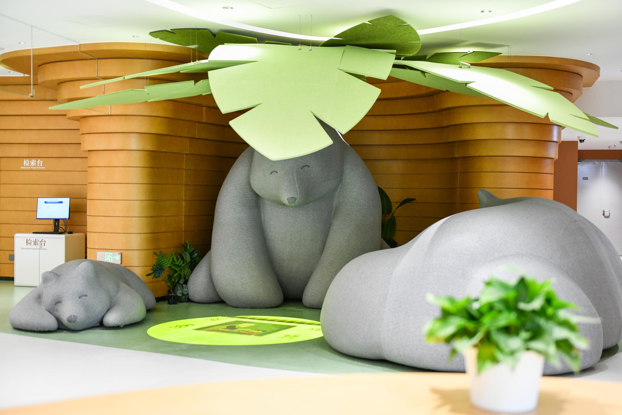 少儿馆位于北京城市图书馆一层西南部,面积为4000平方米,总坐席数约360个,可借阅图书量为6万册。它依托“馆中馆”的设计格局,根据小读者的年龄进行分区管理,北区满足6-12岁读者,南区满足0-6岁读者,0-6岁读者阅读区,设有亲子阅读、少儿中文图书、少儿外文图书、婴幼儿活动区。在这里,一岁的小娃娃可以看到和自己一样高的《给巨人看的书》,也可以趴在地板上翻看“地板书系列”,还可以把手伸进书里“掏个洞”一边看书一边玩手偶。在一个名为“魔法故事熊”的相对私密空间里,妈妈可以带着孩子躲藏在巨大的树叶下面,靠着或者骑在故事熊的身上,利用地面的投影互动装置一起感受阅读的乐趣,一家人共读一本书。
