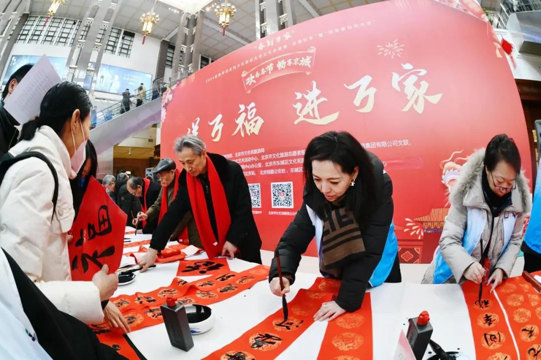 【北京旅游网报道】为丰富市民、游客春节期间的精神文化生活,营造欢乐、喜庆、祥和的节日氛围,由市文化和旅游局指导,市文化馆(北京市文化旅游志愿者服务中心)主办的“欢乐春节 畅享京城”2024北京文化志愿者“送福到家”系列活动于2月2日上午分别在北京大兴国际机场、北京站、朝阳站三地同时启动。活动现场,文化志愿者们将5万5千副春联和福字亲手送给外国游客、各地旅客及机场、车站工作人员。市文化和旅游局党组成员、副局长王洪涛,二级巡视员常林、杨连霞和局机关及市文化馆、首都图书馆相关人员出席启动仪式。
