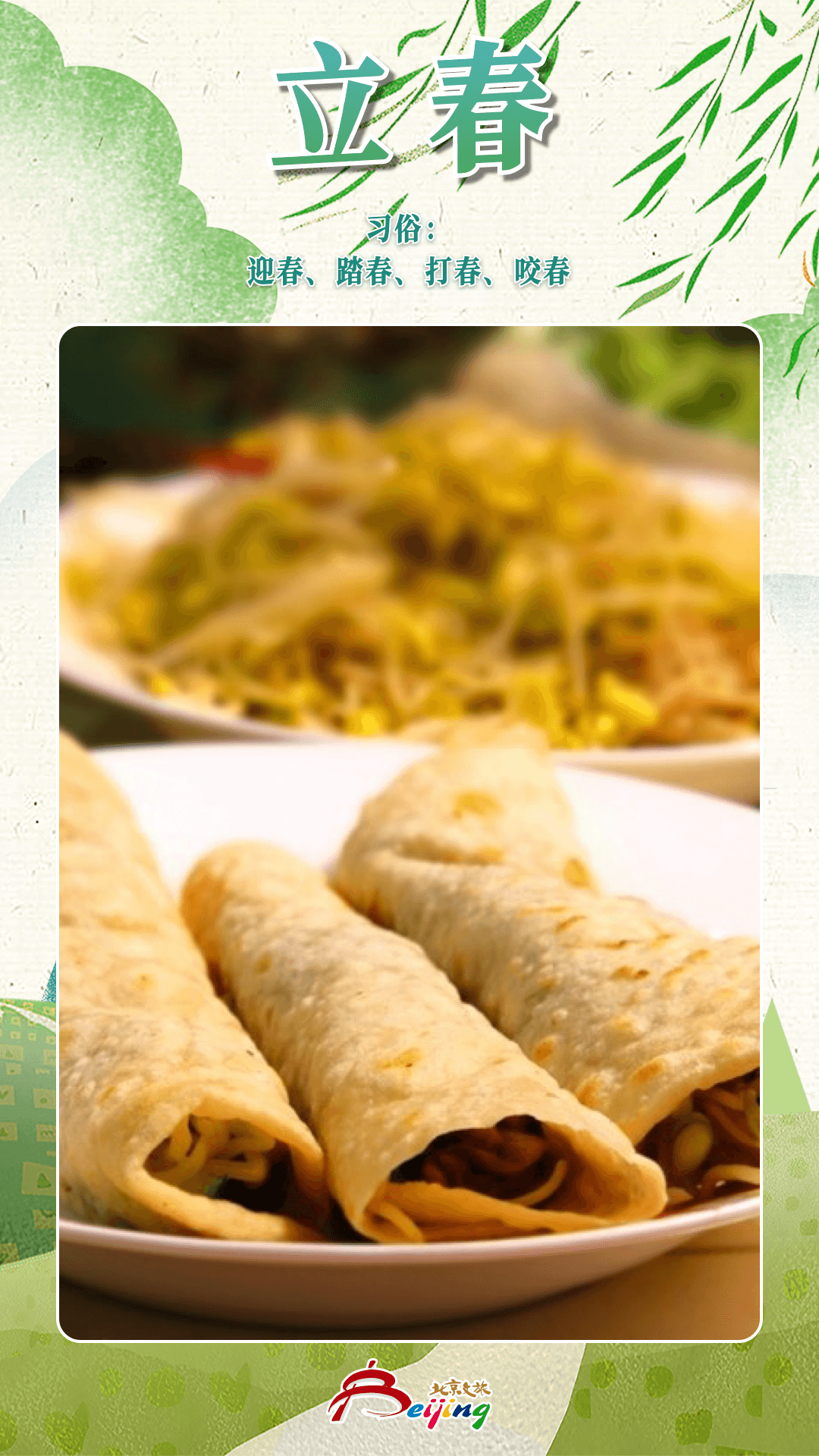 咬春:“立春”这一天,中国民间习惯吃萝卜、姜、葱、面饼,称为“咬春”。但是各地的不同风俗又有不同的表现,在南方则流行吃春卷。民间咬春的另一种食品是萝卜,因为萝卜味辣,取古人“咬得草根断,则百事可做”之意。
