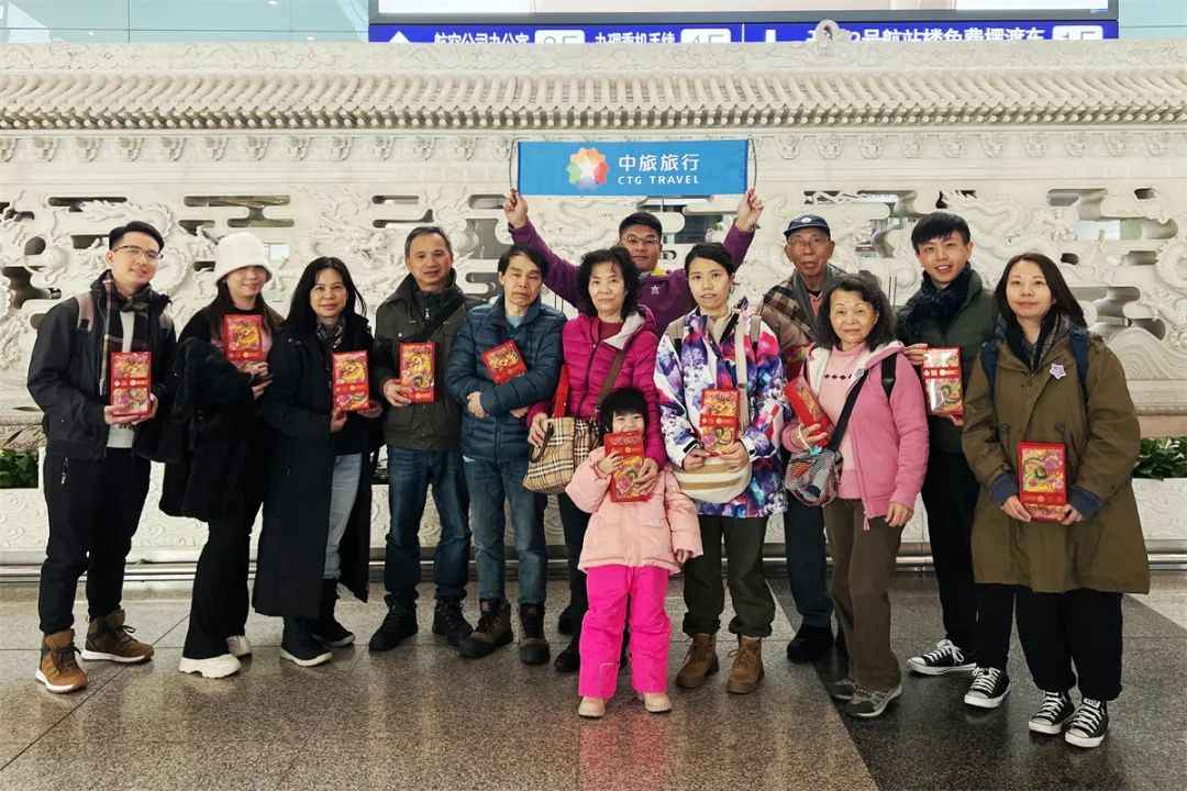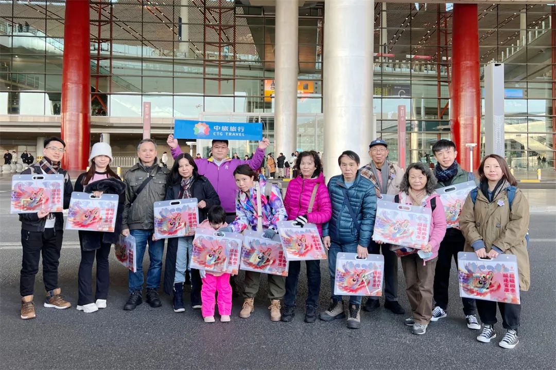 大年初一16时许,16位香港游客也抵达北京首都国际机场,开始为期五天的“北京过大年”新春之旅。游客们在机场也收到了来自北京市文化和旅游局送上的龙年大礼包,包含手作非遗运河龙灯和全球吉庆生肖设计大赛获奖作品七彩祥龙非遗纸雕台历。
