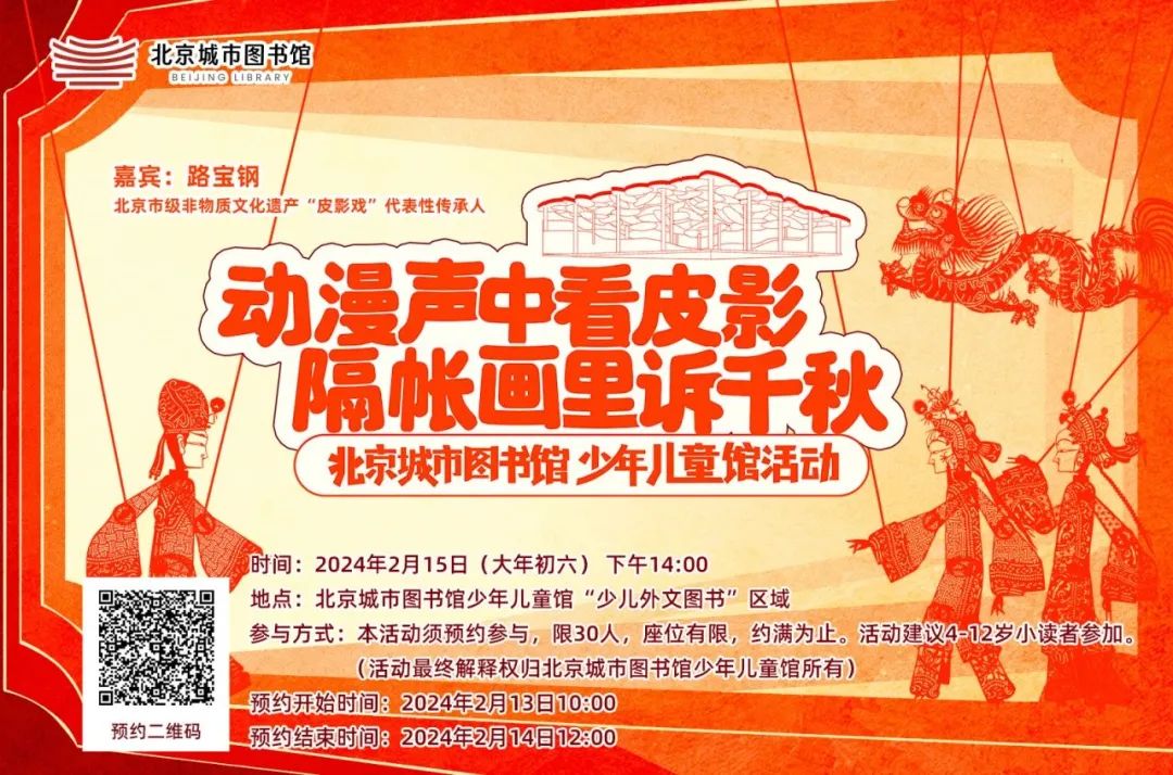 北京城市图书馆少年儿童馆初六下午14:00-16:00举办“动漫声中看皮影,隔帐画里诉千秋”活动,同学们可以听故事、看动漫、了解北京皮影戏的基本知识,还能跟随非物质文化遗产项目“皮影戏”的代表性传承人路宝刚老师一起,探究流传百年的神奇皮影世界。