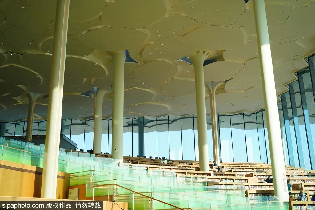 想静心阅读,可以移步图书馆的阶梯阅览区、三层阅览区。想打卡拍照,可在山谷区范围内活动,并在打卡的同时保持安静。山谷区不仅可以看到超挑高的银杏叶屋顶和流动变化的天河,还有特色主题馆分布两旁;中间两棵双松伫立,感受书籍与艺术的生命“对话”。
