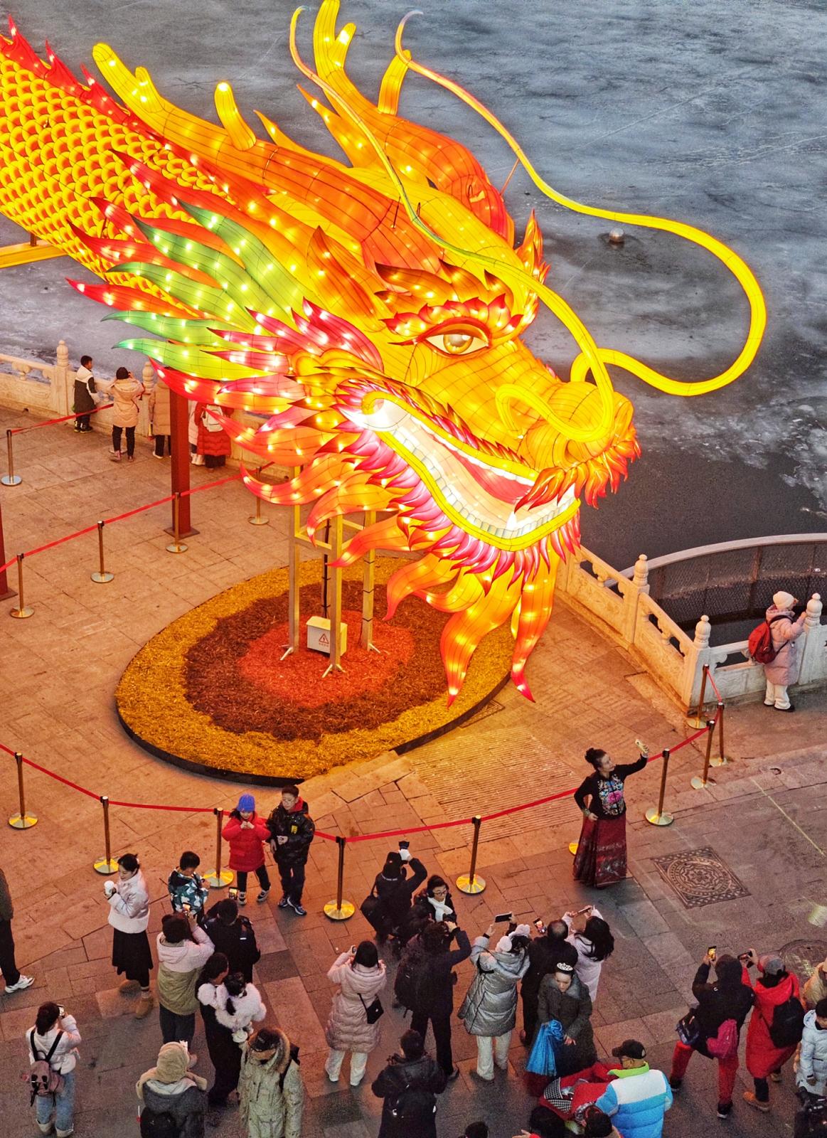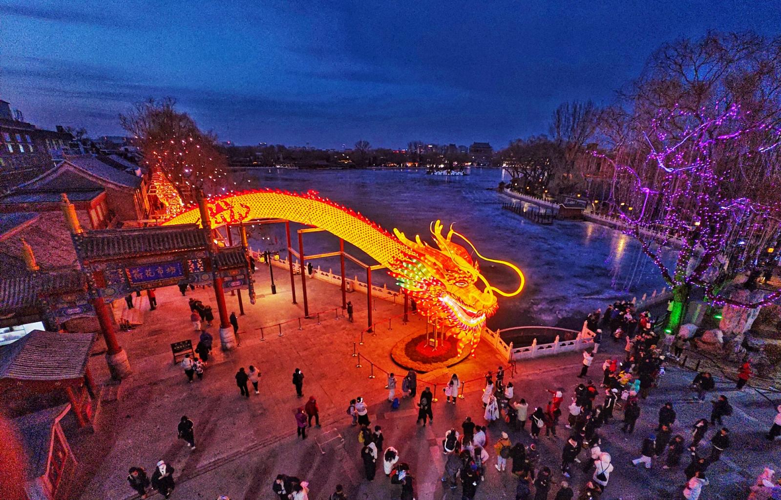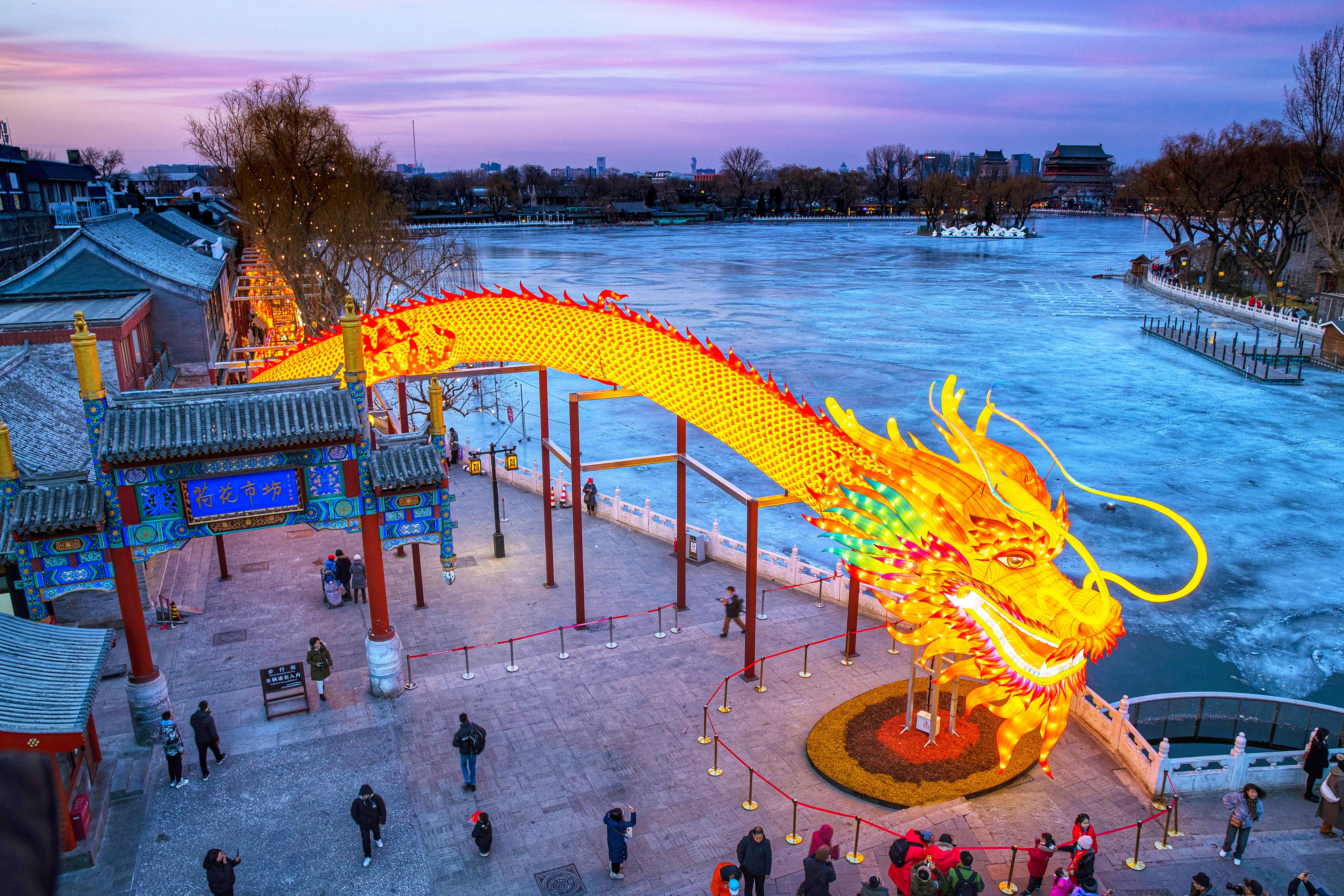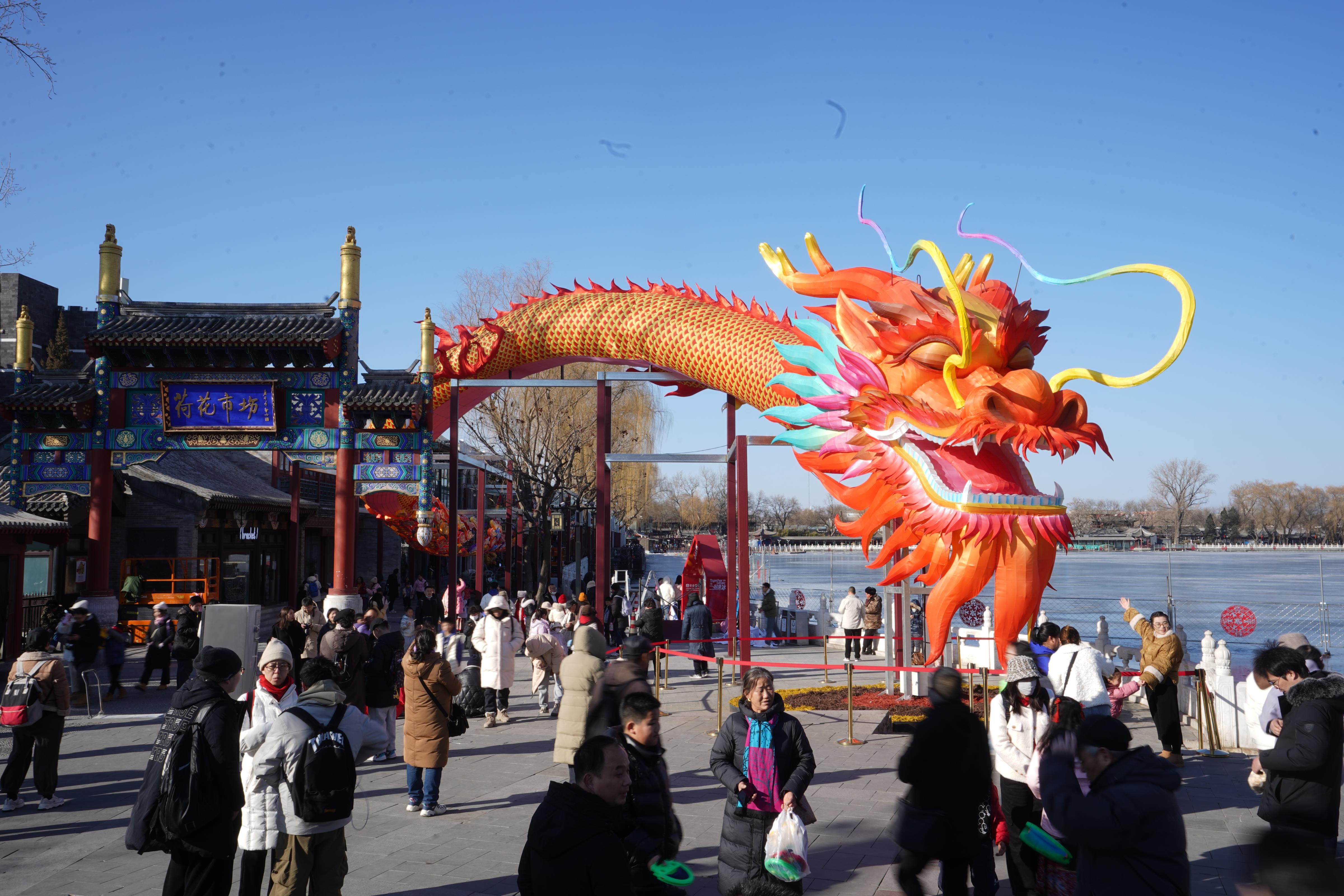 整个春节,什刹海荷花市场牌楼前的小广场人头攒动,游客们在一条从荷花市场牌楼旁飞舞而出、昂首升腾的巨龙边上合影留念。而不少旅游团更是将“蛟龙出海”景观当成了北京旅游必打卡的点位之一。