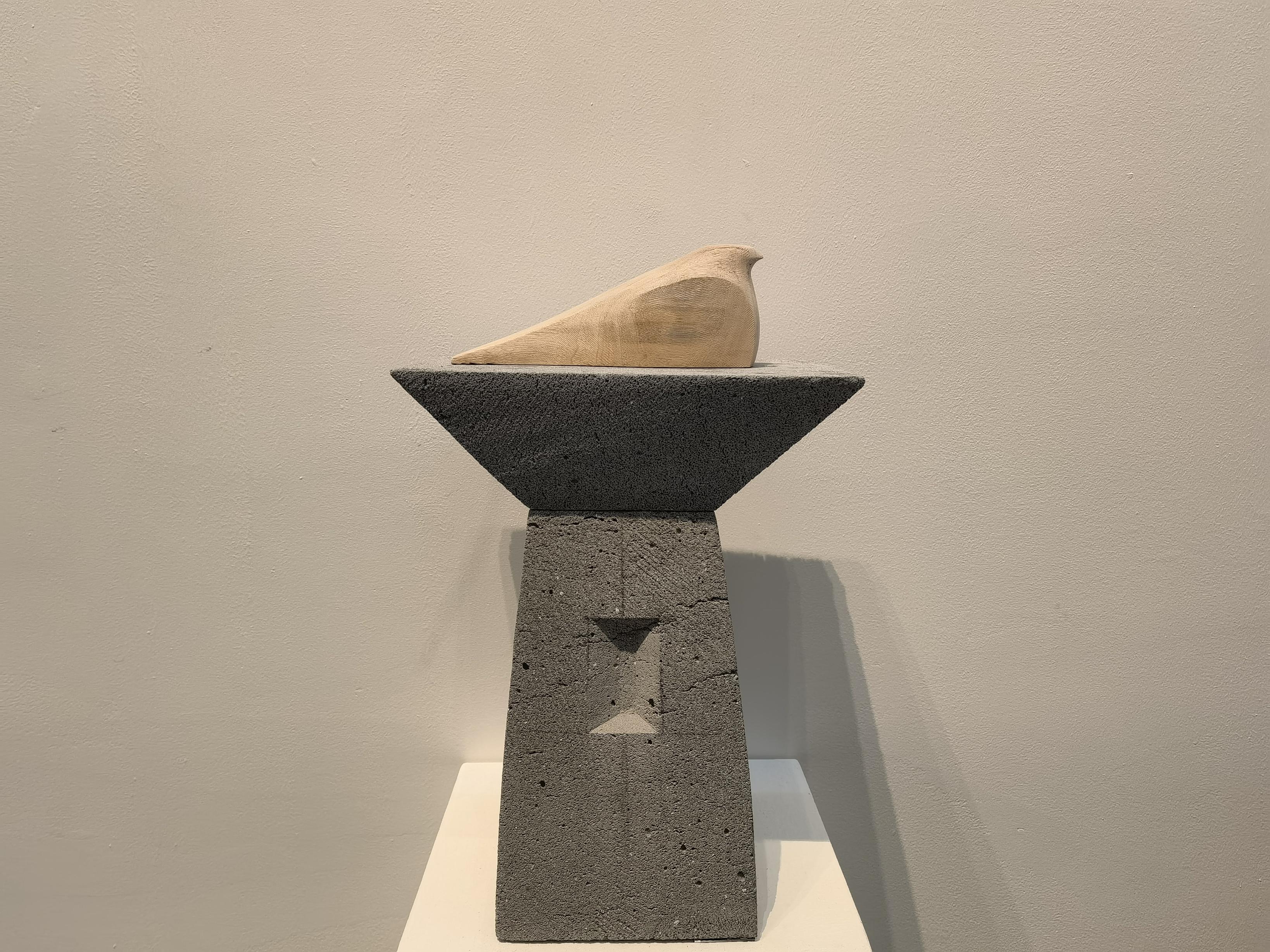 “这件作品是以古代的鼎为灵感创作的,我将猫头鹰展翅的形态夸张化、强烈化,使之与鼎的造型融为一体。”李展介绍,作品《鸮鼎》还设计了一个底座,呈现出一定的建筑感。展览展出的另一件作品《雀台》,引入了汉代建筑“阙”的造型,并让一只木质的小鸟栖息在高台之上。“中国古今丰富的文化遗产,为我们今天的雕塑创作提供了很多可汲取的养分。”