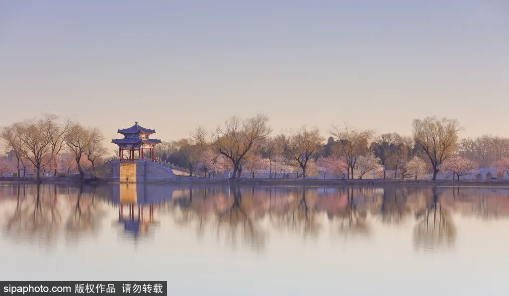 西堤两岸栽植着百余株桃树,当桃花绽放时,人在堤上走,宛若画中游,山桃映碧波,西堤春色的独一无二之处,还在于山桃枝条全部向着昆明湖面延伸,呈现出探水的美态,朵朵桃花漂浮在水面之上,意境清新唯美。