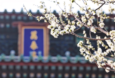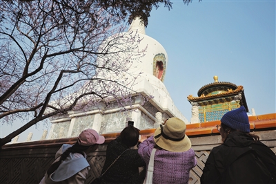 在北海公园白塔塔基周边,栽种着20多棵山桃花。眼下春光明媚,桃花已悉数怒放,白中带粉的花瓣清新唯美,吸引游客拍照。白塔映桃花也是摄影爱好者们的热门题材,他们流连于此,拍下一张张国风大片。游客赏花时可以到白塔下的揽翠轩打卡,这里推出了桃花形状茶点、桃花口味冰淇淋和桃花拉花咖啡等文创餐饮。