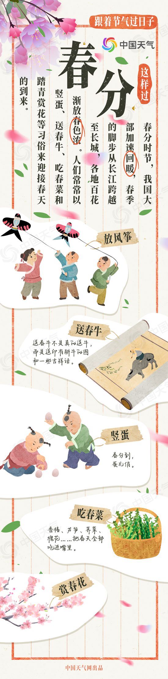 常年春分时节,我国大部地区开启加速升温模式,春天的脚步迅速北扩至长城一线,莺飞燕舞、百花渐开,大自然变得有声有色起来。为了迎接春天的到来,民间有竖蛋、送春牛、放风筝、品春菜等一系列风俗活动。