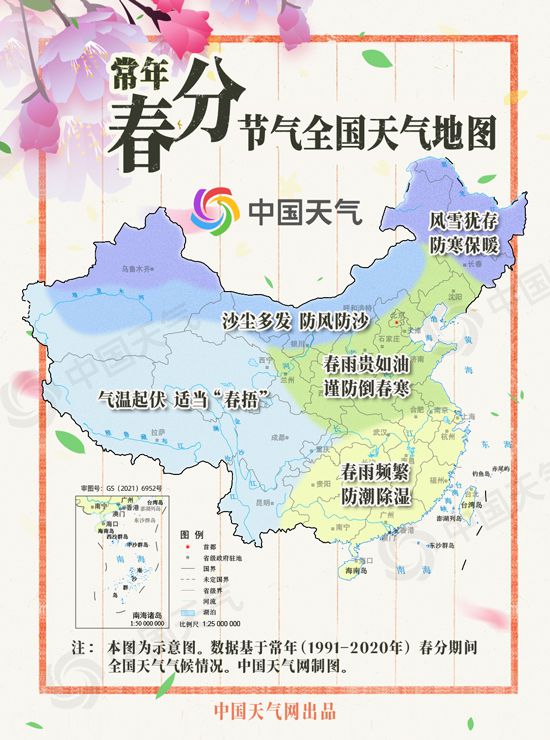 从中国天气网推出的春分期间天气地图来看,进入春分节气,我国大部地区将摆脱严寒,春天的脚步大幅北扩,直抵长城脚下,春暖花开,万物充满生机。不过,随着天气回暖,泥土解冻,北方地区的沙尘天气也增多起来,内蒙古等地进入沙尘的高发期,小伙伴出门要注意查询天气预报,如遇沙尘天气,注意戴好口罩,谨防“吃土”;在东北、西北的一些地区,此时节仍可能飘雪,羽绒服等厚装备不着急收起来,防寒保暖工作还要继续做好。