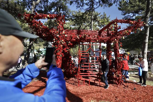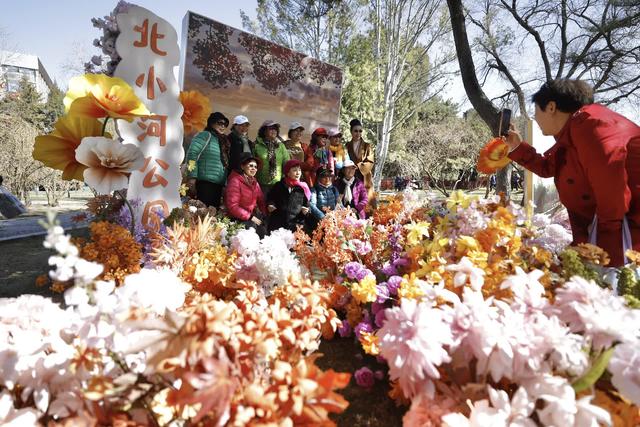 一只大花筒倾斜着,数不清的花朵“倾泻而下”,流淌得满地都是,这是日坛公园用小雏菊、虎耳草、绣球等花卉布置的打卡地。大望京公园则用园林绿化废弃物搭建了一座“望京台”,以仿真月季点缀。此外,温榆河公园的向日葵、奥林匹克森林公园山桃、红领巾公园的荷花、元大都公园的海棠……各公园都带来了花卉主题展。