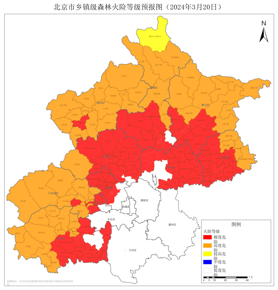 受18日、19日连续大风影响,本市林区空气湿度及可燃物湿度将持续降低,本周前期森林火险气象条件差,可燃物引燃风险高;至22日天空云量增多,天气逐渐转阴,空气湿度升高,全市森林火险将短暂降低,至23日、24日偏北风影响,林区火险将再次升高。预计,3月18日至24日,本市大部分地区大部分时段森林火险等级将处于高度(橙色)及以上危险等级;其中,20日昌平大部、顺义大部、平谷大部以及房山东部、门头沟东南部、石景山西北部、海淀西北部、怀柔南部、密云南部森林火险等级将处于极度(红色)危险等级;21日房山东南部、海淀北部、昌平东部、顺义西部及南部森林火险等级将处于极度(红色)危险等级;23日昌平东部、顺义西部及南部森林火险等级将处于极度(红色)危险等级;24日昌平及顺义大部森林火险等级将处于极度(红色)危险等级,需重点关注。